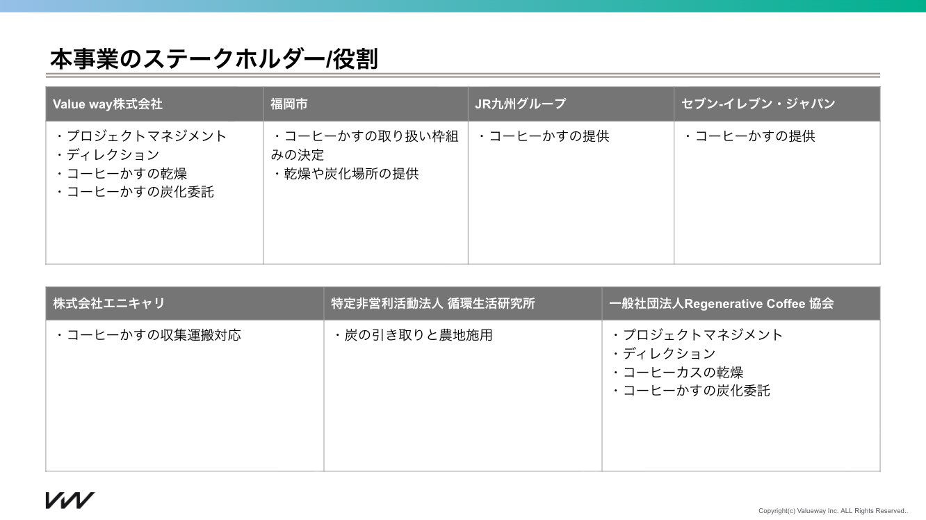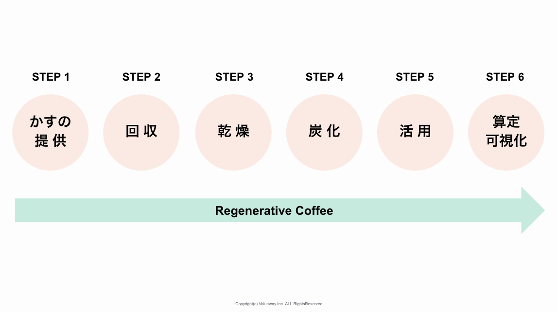 2025年12月より福岡市の承認のもと、福岡市内のセブン‐イレブンやJR九州グループ(JR九州リテール)が運営する店舗の約10店舗から排出されるコーヒーかすを、エニキャリの動脈物流網を活用してルート回収し、福岡市内で移動式炭化装置を活用してバイオ炭を製造。製造されたバイオ炭は、土壌改良材として活用し、循環生活研究所の管理する農地で散布されます。またコーヒーバリューチェーンでの一連の工程においてどのくらいの温室効果ガスを排出しているかの算定・可視化をValue wayにて行い、消費者・事業者の行動変容のきっかけを図る実証事業を実施しました。なお全体のプロジェクトマネジメント・ディレクションはValue way・Regenerative Coffee 協会が行います。