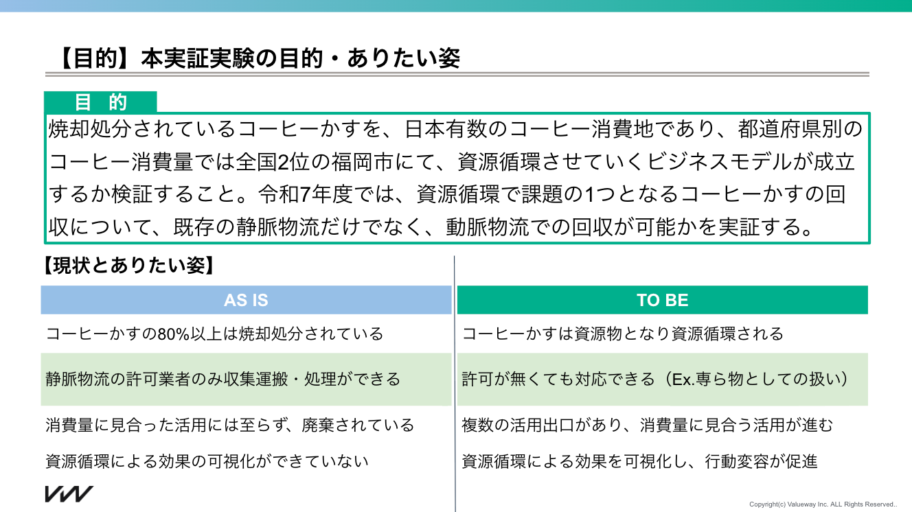 コーヒーかすは全国各地で季節問わず一定量排出されており、どの地域でも資源循環による事業性を有しています。世界的にもコーヒーかすを活用した資源循環が推進される動きがあり、国内においても排出事業者における課題意識や、一般消費者におけるアップサイクルの認知度・事例などを背景に、取り組みが進んでいます。福岡市を起点に、普段の暮らしで身近に感じられるコーヒーかすから資源循環を実現し、地域課題の解決と脱炭素の両立を目指します。