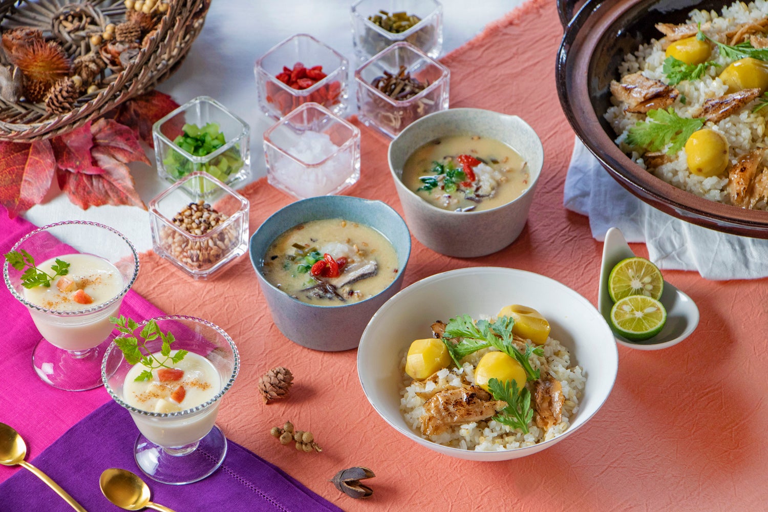秋の味覚にプラントベース食材をかけ合わせた<メイン料理>炙り「ライクチキン」ともち麦栗ごはん、<スープ>スーパーフードで食べる 精進出汁のクリームスープ、<デザート>甘酒とりんごのライスプディングの3メニューに加え、各ホテルが地域に合わせて考案し、腕をふるった2メニューの合計5メニューを朝食ビュッフェでご提供。その他、地元の食材や郷土・名物料理を含めて常時40メニューをご用意しております。