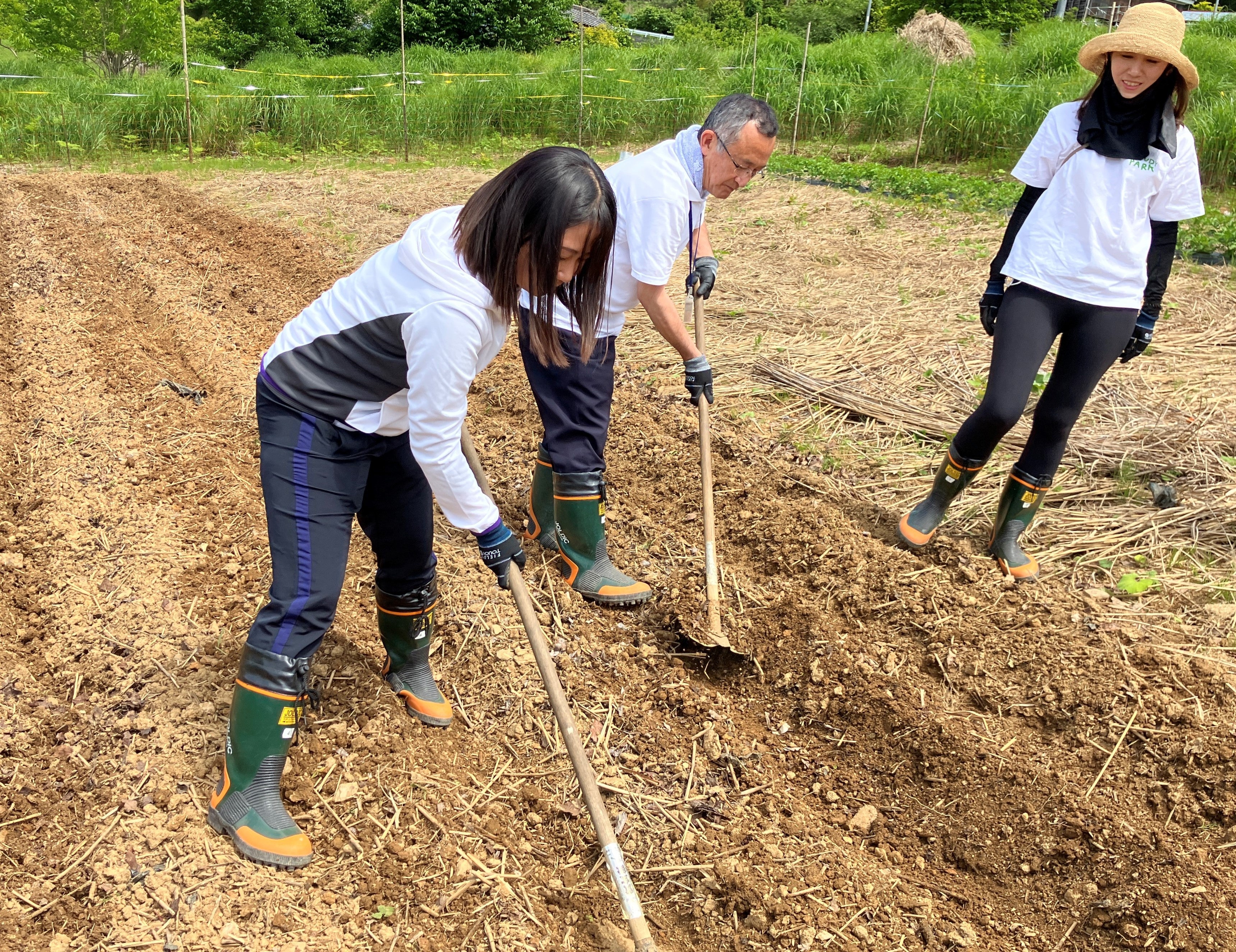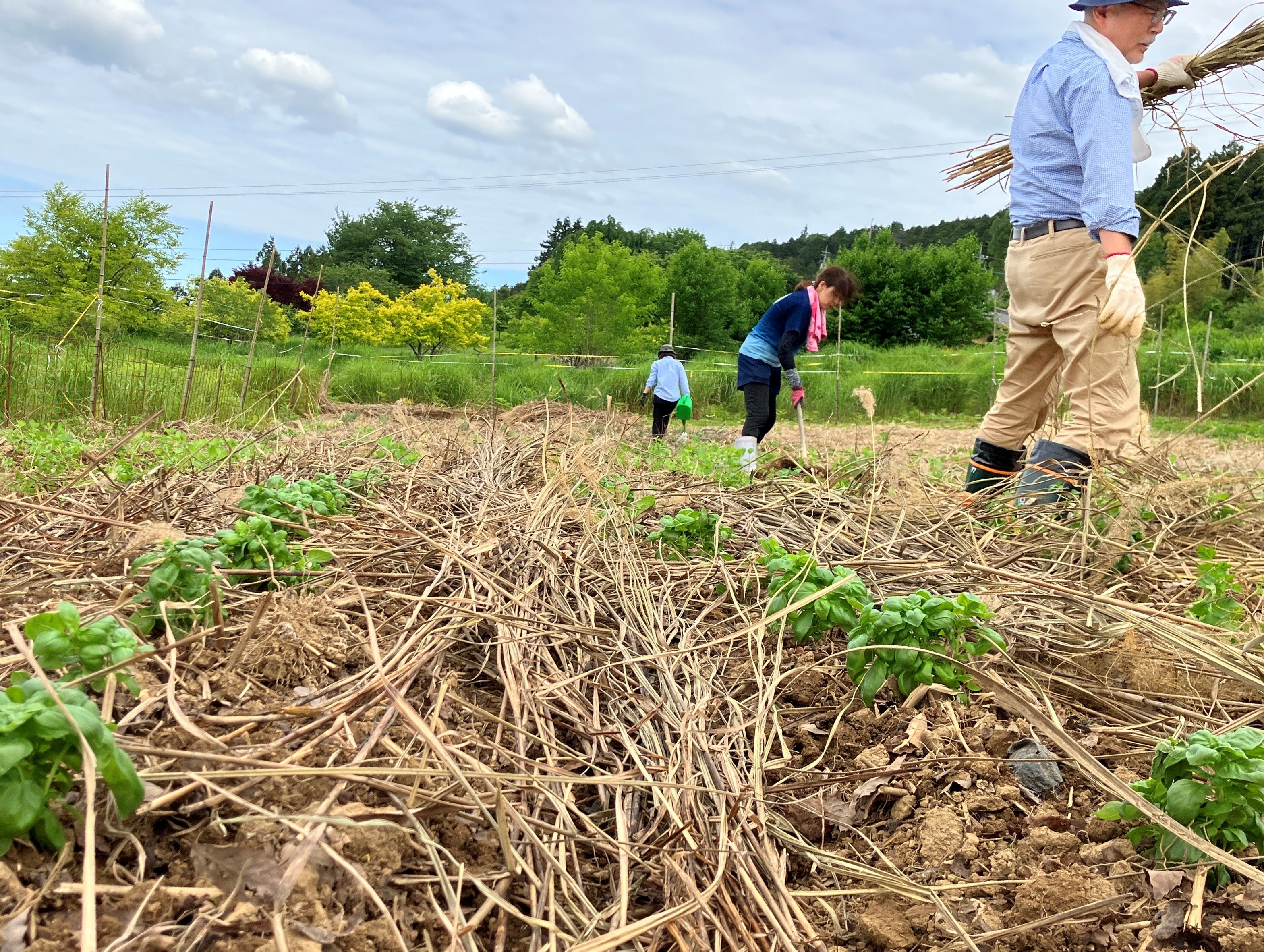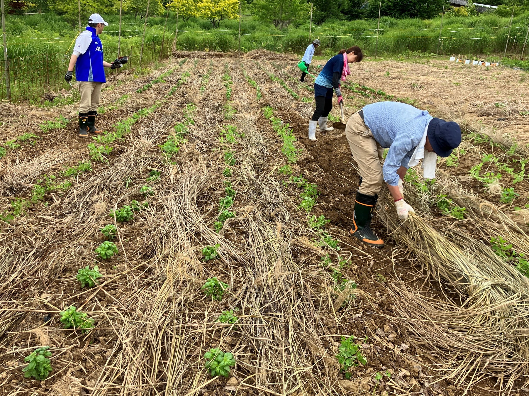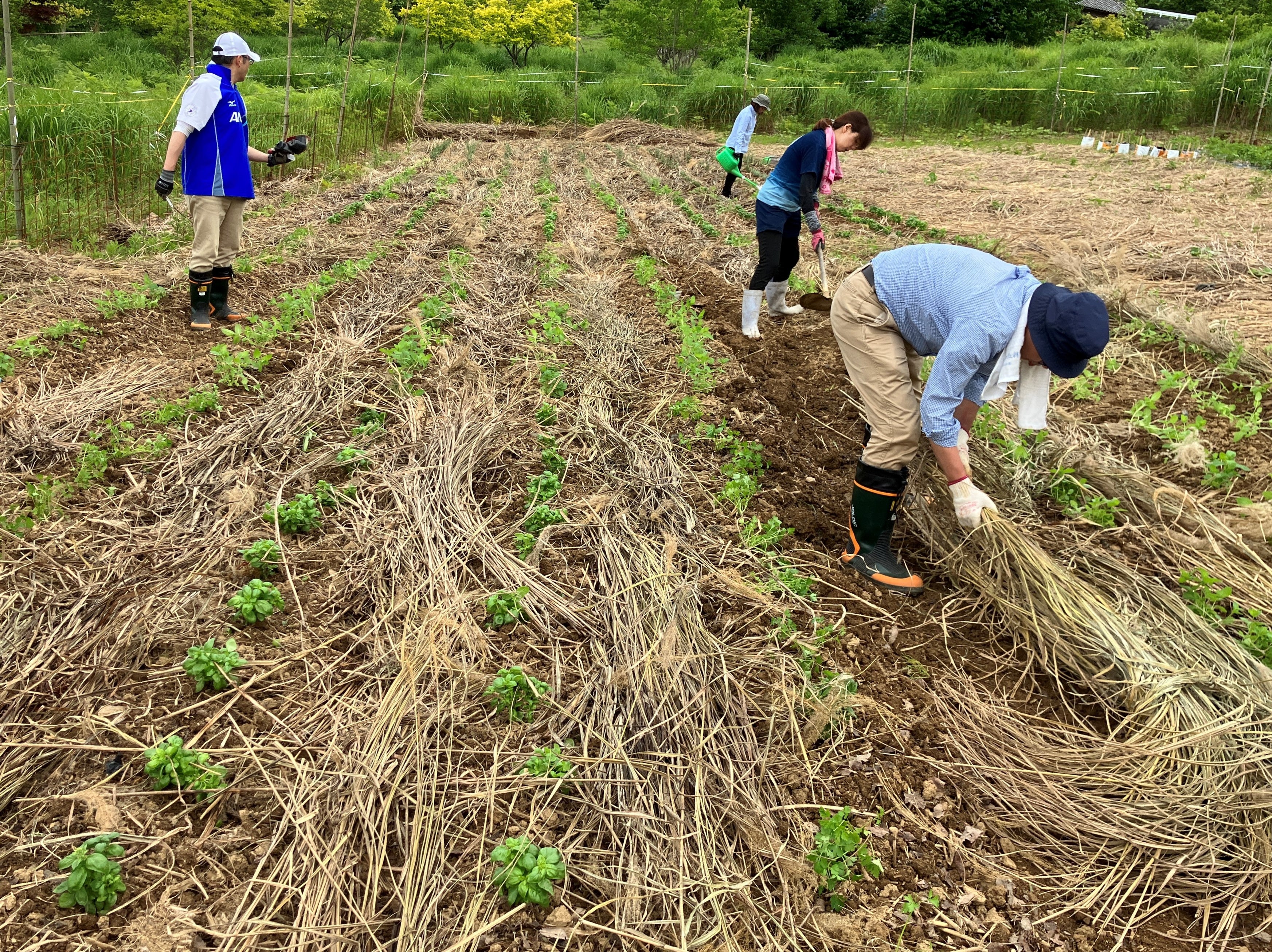 天空の集落(ソラ)の畑での栽培実験の一つとして、5月25日にローズマリー、セージ、タイム、バジルなどのハーブの苗植えを実施しました。プロジェクト参加団体の皆様とともに当社従業員も参加し、約3アールの農地で、畝(うね)の造成、苗の植え付け、カヤ(敷き草)のすき込み、水やりを行いました。