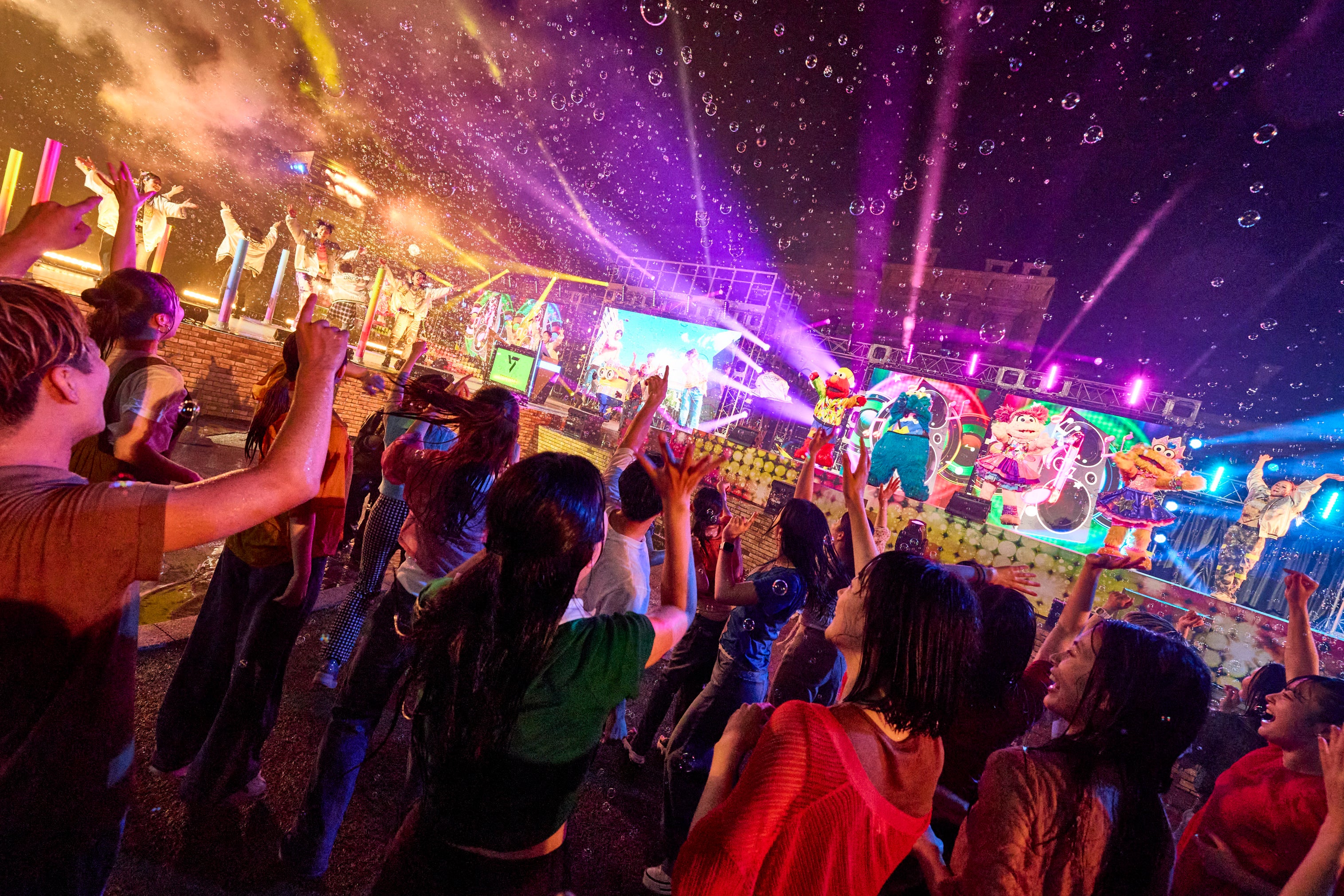 本日午後6:45ごろ、グラマシーパークの特設ステージで、『NO LIMIT! サマーダンスナイト with HYBE JAPAN』がスタートしました。世界中で爆発的な人気を誇る「HYBE LABELS」のアーティスト「BTS」、「SEVENTEEN」、「TOMORROW X TOGETHER」、「ENHYPEN」、「LE SSERAFIM」、「NewJeans」、「&TEAM」、「BOYNEXTDOOR」の大ヒット曲が次々と大音量で響き渡り、巨大スクリーンにミュージックビデオが流れるなか、ダンサーたちが迫力のパフォーマンスを魅せると、会場から大歓声が巻き起こりました。「BTS」の「IDOL」、「SEVENTEEN」の「Super」など世界的なヒットナンバーに合わせて、夜空を照らすライティング、ウォーターエフェクト、バブルマシーン、スモークなどの特殊効果で会場全体がド派手な演出で彩られました。ミニオン、セサミストリートの仲間たち、ハローキティたちがキレキレのダンスで沸かせ、会場を埋め尽くした1500名の特別招待ゲストはスプリンクラーから降り注ぐ爽やかな水包まれ“超興奮”の渦に全身で“DIVE”し、踊って歌って、心の底から弾けて、ユニバーサル・スタジオ・ジャパンだけの特別な夏の夜を存分に楽しみました。