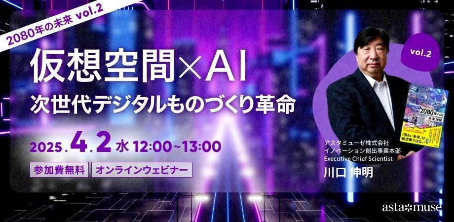 アスタミューゼ株式会社(本社:東京都千代田区、代表取締役社長 永井歩)は、2025年4月2日(水)12:00-13:00に、『2060 未来創造の白地図』および『2080年への未来地図』著者、弊社のExecutive Chief Scientistである川口伸明による無料ウェビナー「仮想空間×AI:次世代デジタルものづくり革命 ~2080年の未来シリーズvol.2~」を再開催いたします。書籍に取り上げた技術領域や社会課題、未来世界について語るウェビナーです。