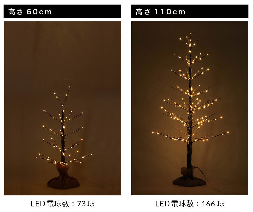 高さ60cmのツリーはLED電球が73球、高さ110cmのツリーはLED電球が166球と全体にバランスよくLEDライトがついているので、そのまま飾るだけでもとても綺麗です。