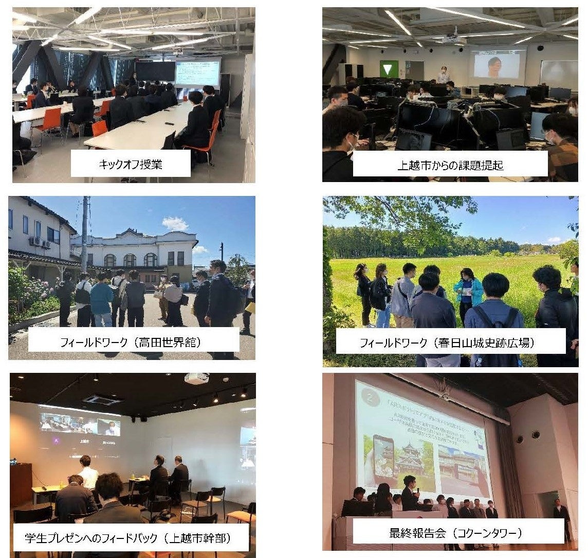 IPUTの学生(以下、学生)が、新潟県上越市の掲げる「大勢の来訪者が年間を通して楽しめるまち」の実現に向けて、社会人、地域の方々との対話やフィールドワークを通じて、学生の視点とAIやARなどのテクニカルスキルを活かしながら上越市の課題を把握し、解決策・企画案をまとめます。この一連の実習を通じて、学生一人一人は、自分のやりたいこと、強みを発見できるようにします。