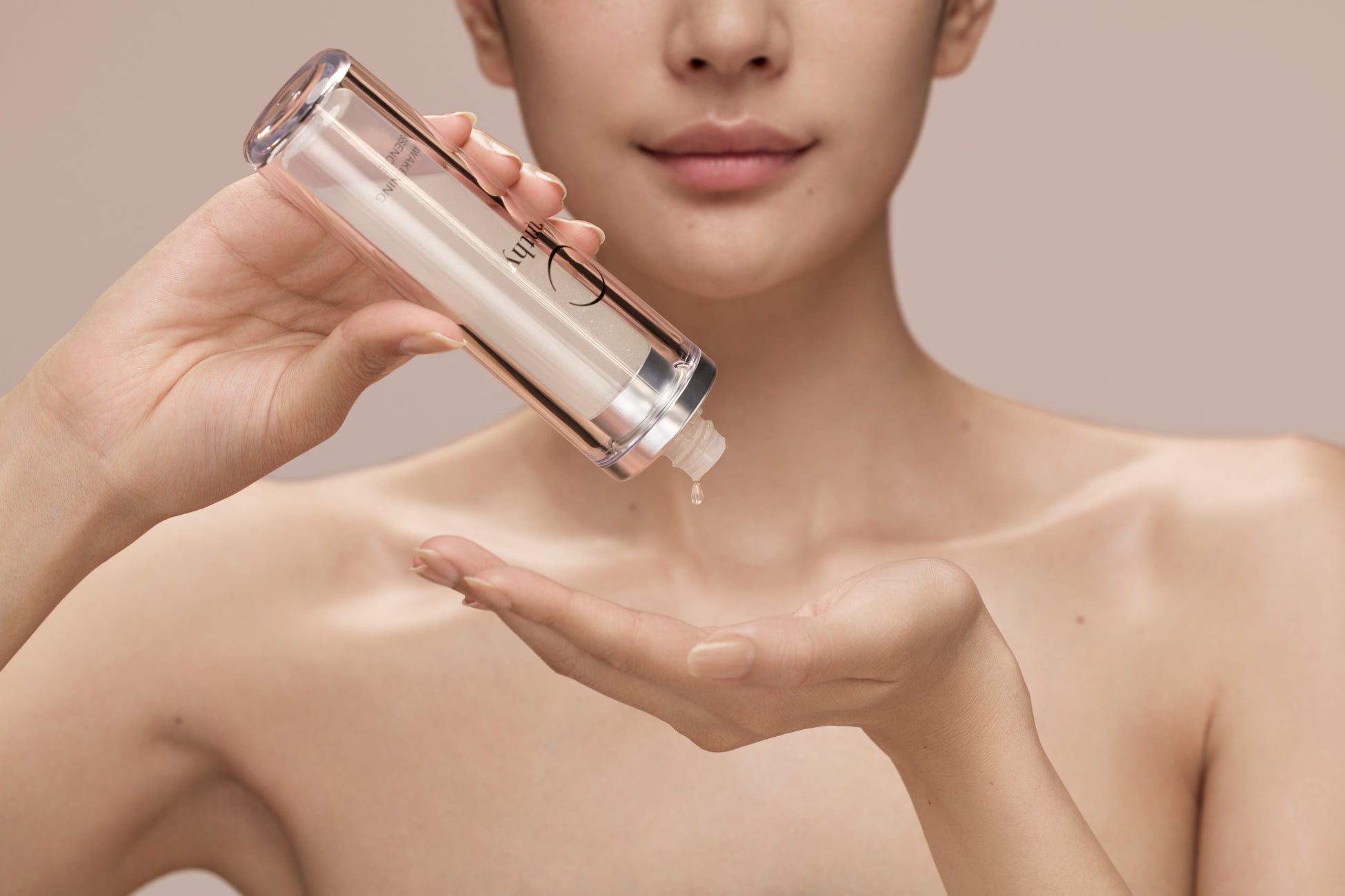 洗顔後、ボトルを5回ほど振って2層をよくブレンドしてから、適量を取って両手に軽く広げ、顔全体になじませます。