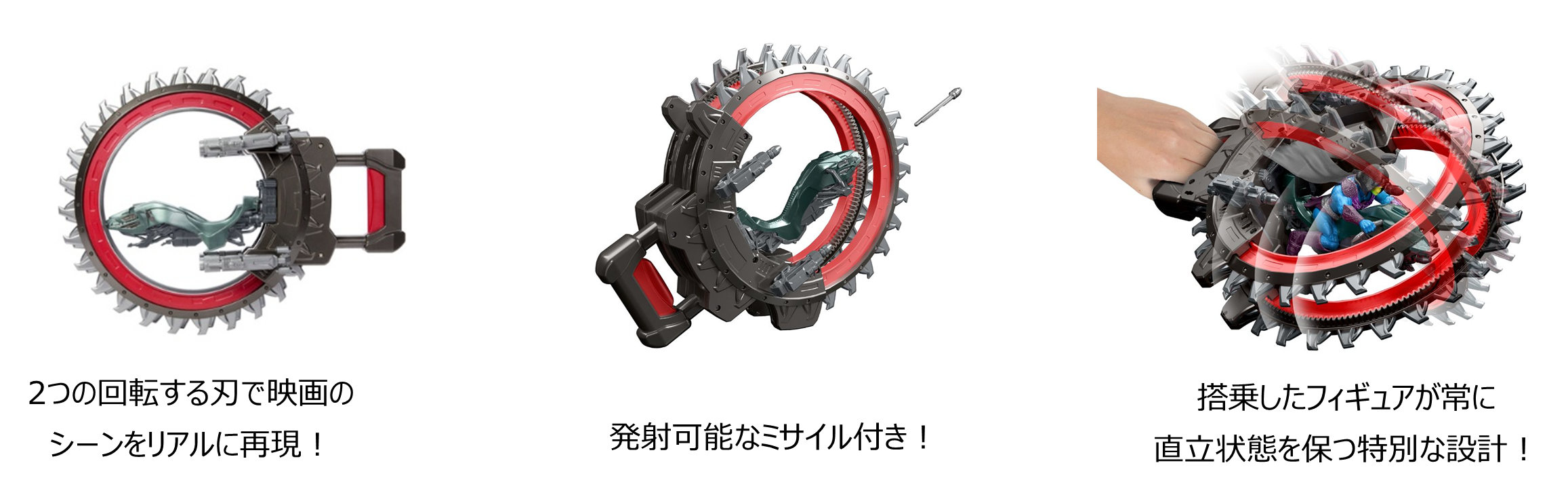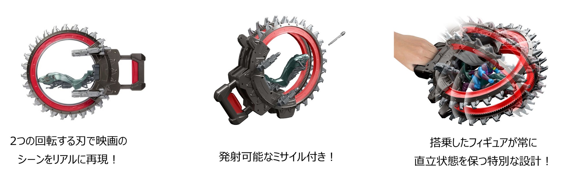 マスターズ・オブ・ユニバースの世界がさらに広がる、悪役スケルターの軍団が操る象徴的な戦闘用ビークル「ロトン・アサルト・ビークル」が登場します。本体に備えられた2つの回転ブレードと、合計4発のミサイルを発射可能な2基のブラスターを備えた精巧なデザインが特徴です。ハンドル付きでスムーズに操縦でき、映画のシーンをリアルに再現して遊ぶことができます。座席は約14cmサイズのフィギュア(別売り)に対応しており、ブレード回転中も搭乗したフィギュアが常に直立状態を保つ特別な設計で、遊ぶ楽しさはもちろん、コレクションとしても楽しめます。