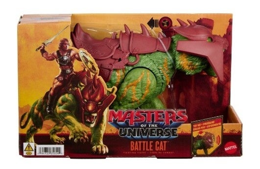ヒーマンの忠実で力強い相棒であるバトルキャットの、迫力たっぷりなアクションフィギュアです。全長約28cm、高さ約12cmで6箇所可動し、ボタンを押すことで5種類の迫力あるトラの咆哮が鳴り、噛みつきアクションが発動します。別売りの約14cmのヒューマンフィギュアを背中のサドルに乗せることも可能で、自分だけの物語を考えながら、遊びの世界がさらに広がるワクワク感が楽しめます。