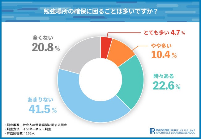 そこで今回、通信教育講座『諒設計アーキテクトラーニング』(https://www.designlearn.co.jp/)を運営する株式会社新生技術開発研究所は、スマホ・パソコン・タブレットからいつでも資格取得の勉強ができるオンライン講座「スマシカ」を開講したことに伴い、何らかの勉強をしている全国20〜60代の社会人男女106名を対象に、社会人の勉強場所に関する調査を実施しました。