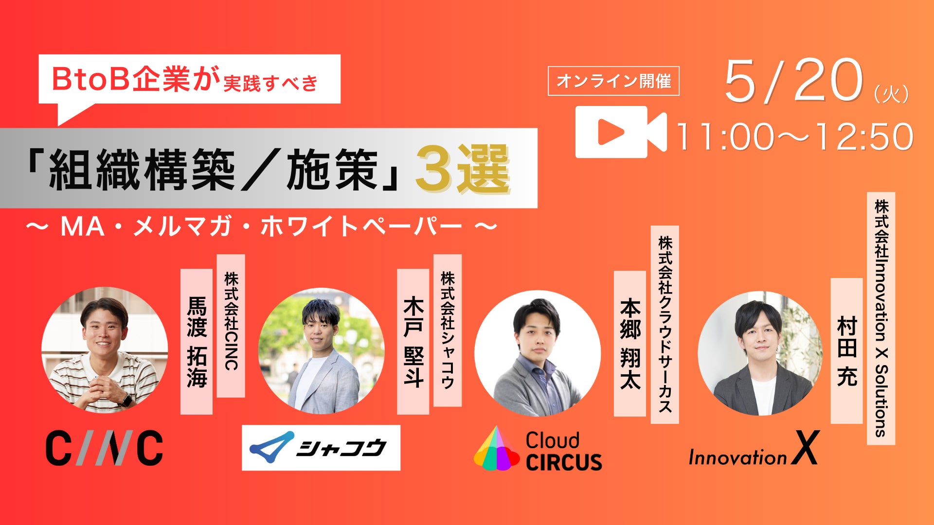 株式会社イノベーション(東証グロース 証券コード3970)のグループ会社である、株式会社Innovation X Solutions(本社:東京都渋谷区、代表取締役社長:歐陽 聖司、以下「Innovation X Solutions」)は、2025年5月20日(火)に「B to B企業が実践すべき「組織構築/施策」3選 〜 MA・メルマガ・ホワイトペーパー 〜」をテーマとしたセミナーを株式会社CINC、クラウドサーカス株式会社、株式会社シャコウと共催で開催します。