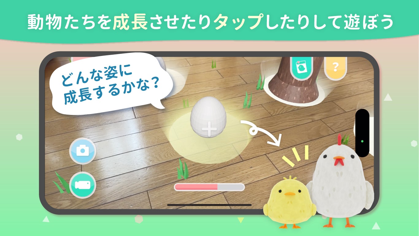 「おおきくなぁれAR」は、LiDARスキャナ※で壁や家具を認識し、動物たちが実際に部屋を歩き回っているような没入感を楽しめる新しいARアプリです。カメラを通して動物や植物を見つけて「おおきくなぁれ」と成長させたり、3Dの生き物たちをじっくり観察することができます。こうした魔法の様なワクワクする体験は、お子様の好奇心をくすぐり、豊かな想像力を引き出すとともに、最新のテクノロジーに楽しく触れることで、科学技術に対するポジティブな感情を培います。
