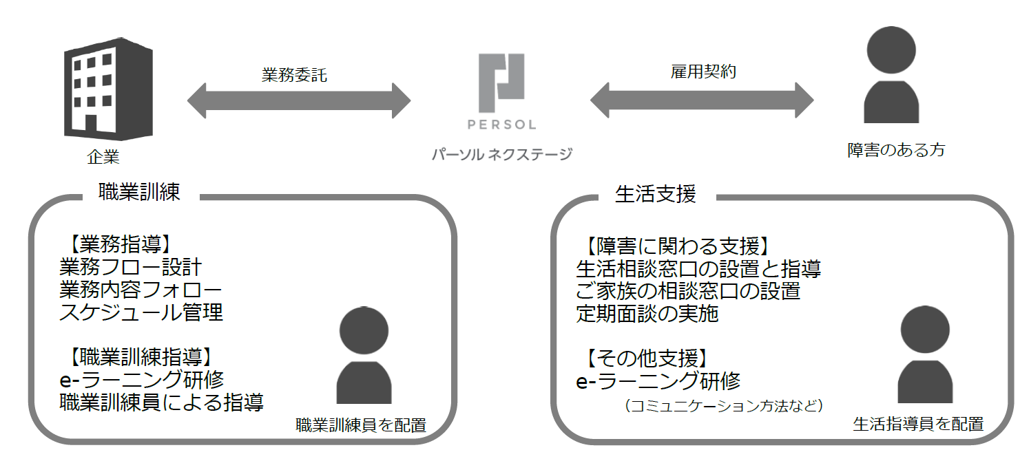 パーソルネクステージは障害のある方と雇用契約を結んだ上で、はたらく機会と必要な支援を行う「就労継続支援A型」※に分類される福祉サービスを提供します。同社では首都圏を中心とした全国の企業から、IT業務を中心とした、テレワークで遂行可能な業務を受託。障害のある方は、パーソルネクステージで有期社員としてそれらの業務を遂行しながら、スキル習得・実務経験を積み、一般企業への就労を目指します。
