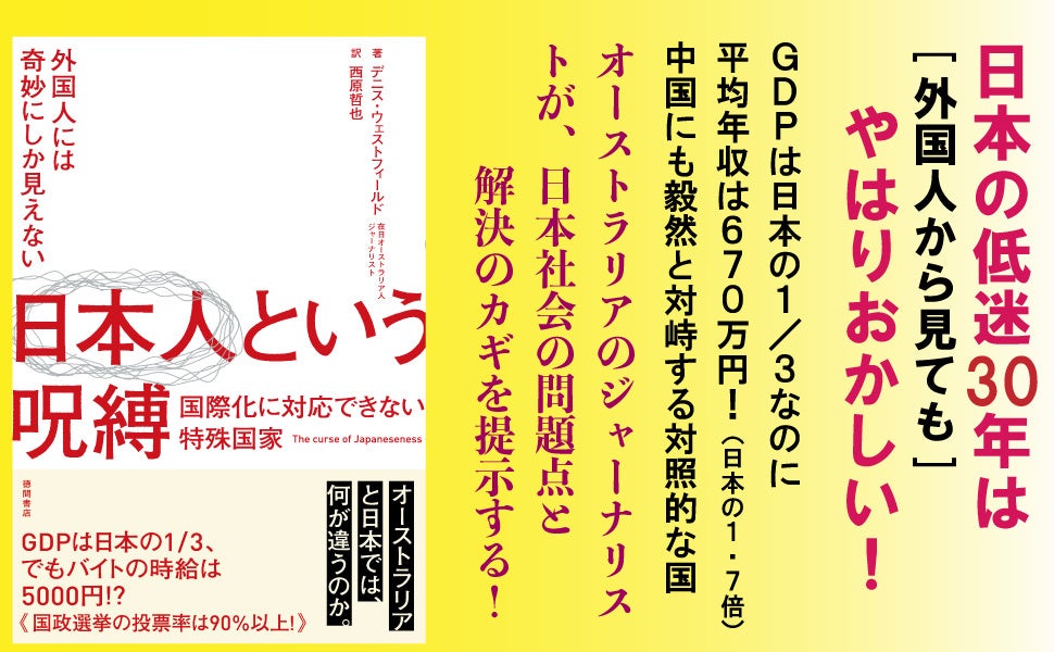 株式会社徳間書店(本社:東京都品川区、代表取締役社⻑:⼩宮英⾏)は、30年前から日本文化の虜になり、日本にも暮らし、日本社会を観察してきたというオーストラリア人ジャーナリスト、デニス・ウェストフィールド氏による、『外国人には奇妙にしか見えない 日本人という呪縛〜国際化に対応できない特殊国家』(訳・西原哲也)(https://www.tokuma.jp/book/b638930.html)を12⽉23⽇(土)に発売することをお知らせいたします。
