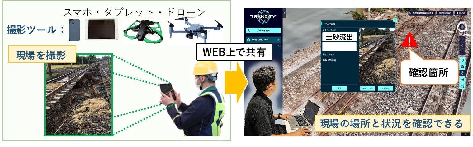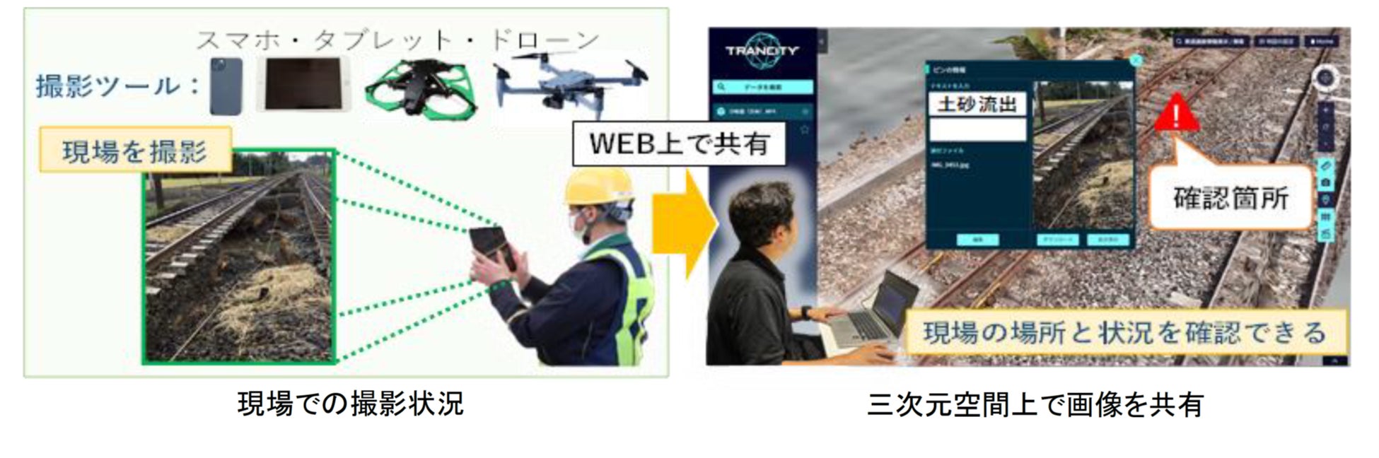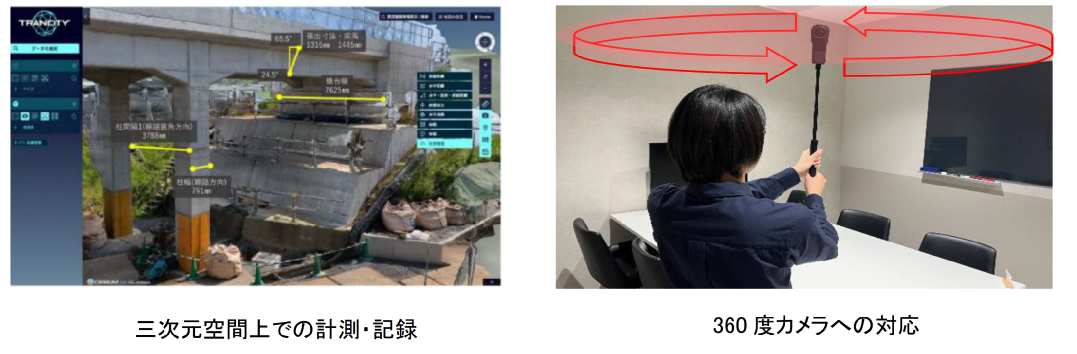 「TRANCITY」は、小型ドローンやスマートフォン等で撮影した動画をアップロードするだけで、電子地図上に点群が自動で生成されます。また、BIM※2データや点群データも重ねて表示することができ、それらのデータを時系列表示して管理することが可能です。今回、鉄道事業をはじめとする多くのインフラ事業や製造業等からいただいたご意見を踏まえ新機能を開発しました。