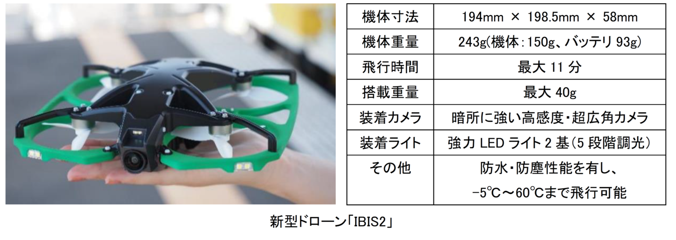 「IBIS」は、屋内空間に特化して開発された小型ドローンで、狭小空間や高所、危険な箇所を人の代わりに調査します。鉄道施設をはじめ、多くのインフラ設備点検に活用する中で寄せられた様々なニーズへ対応するため、「IBIS2」を開発しました。