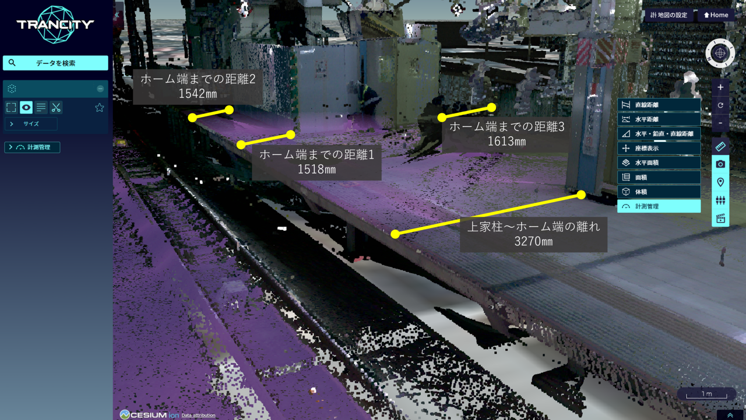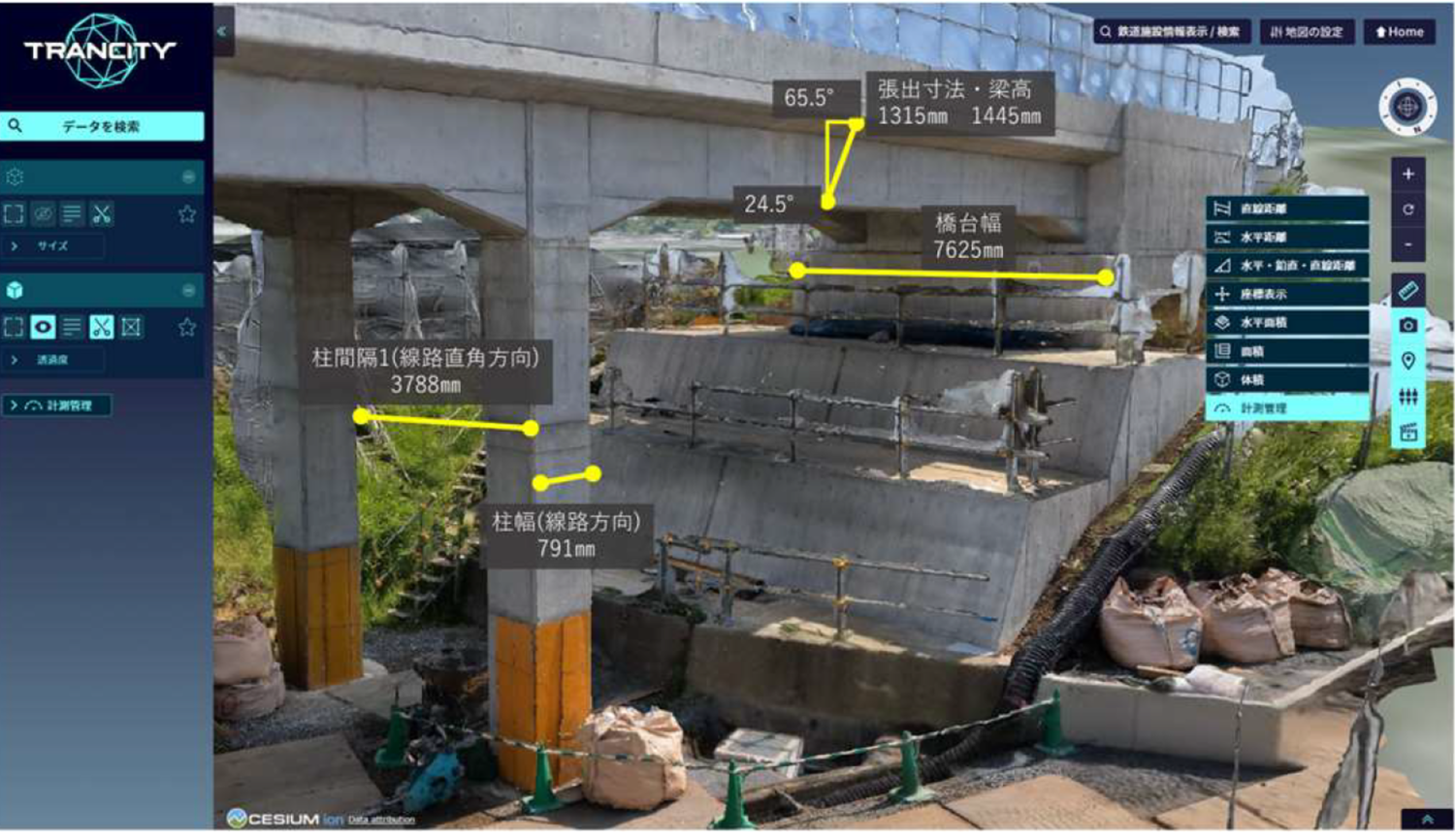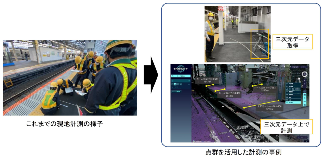 JR東日本では鉄道設備の改良・新設をする際に、鉄道設備の計測を行っています。これまでは、多くの社員が現地に赴き、計測した結果を記録していましたが、少人数で三次元データを取得し、計測をデジタル空間上で行うことで、計測作業や帳票作成作業の省力化を進めています。今回の「TRANCITY」のアップグレードにより、計測記録のデジタル化の推進が期待できます。