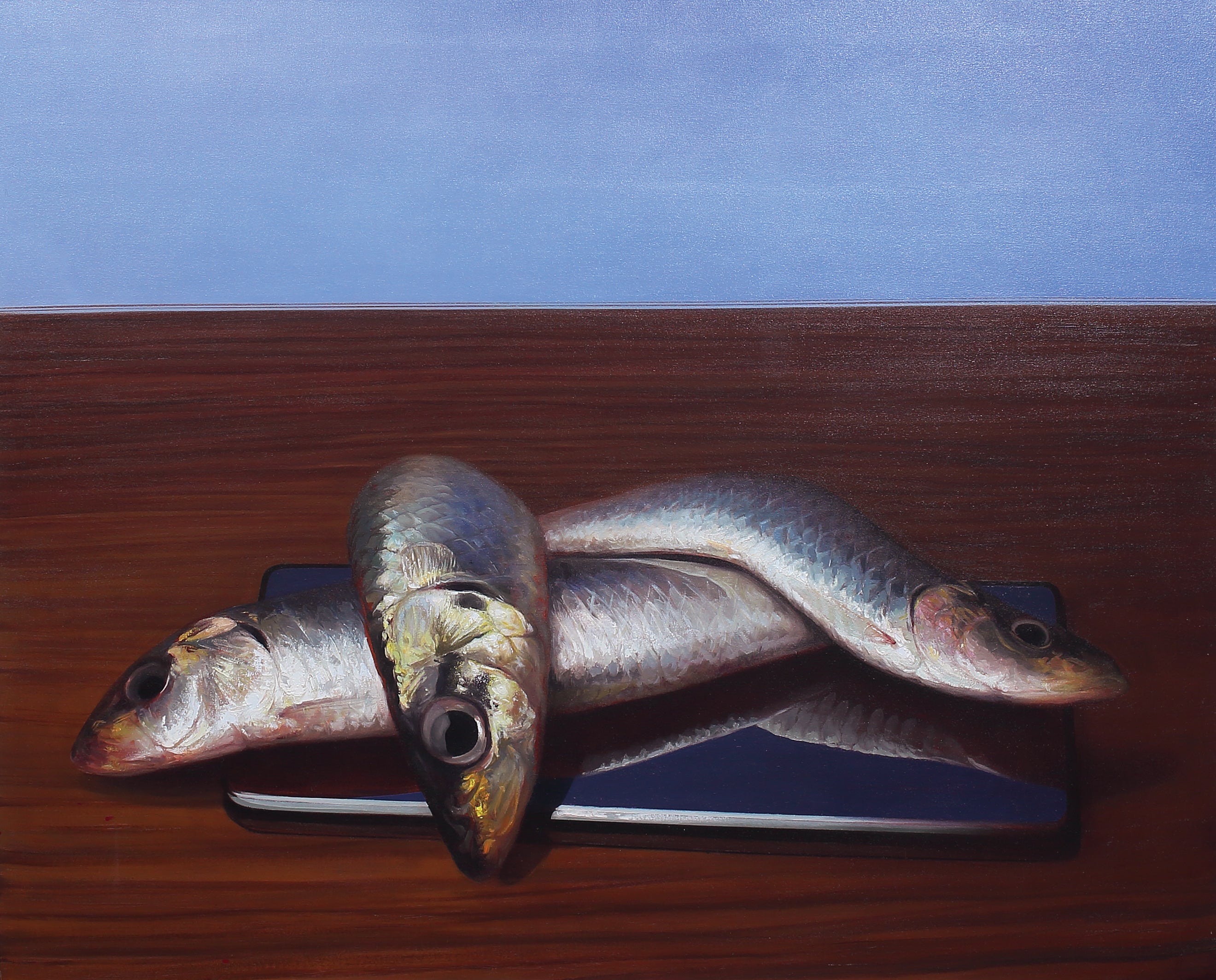 ほとんどの場合、人間は魚を死骸の状態でしか見ません。スマートフォンに映るものは現実とは切り離された世界です。その二つは、ともに生きた関係を失い、触れるという行為を通してしか人間と関わることができない点で共通していると思い、描きました。