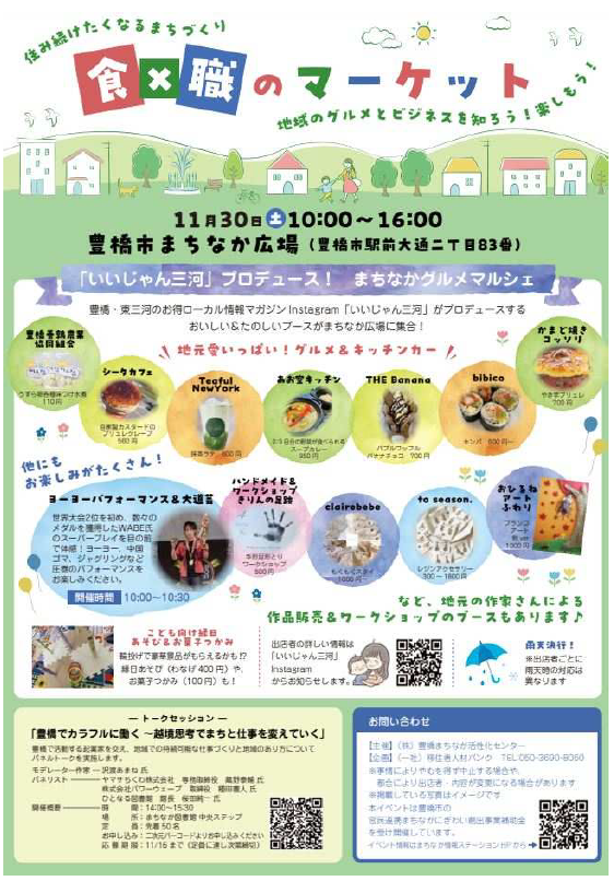 まちなかエリアを会場に豊橋市が”持続可能なまち”であることを「食:フードマルシェ」×「職:ビジネスマン向けトークセッション」の実施を通して地域内外にPR します。