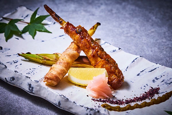 山形県産の姫竹の子を炭火で焼いた豚バラ肉で巻き、竹の子の甘みと肉の香ばしさを感じていただける一品。お酒との相性も抜群です。