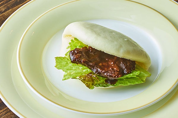 「山形県産牛肉の甜麺醤炒め 蒸しパン挟み」