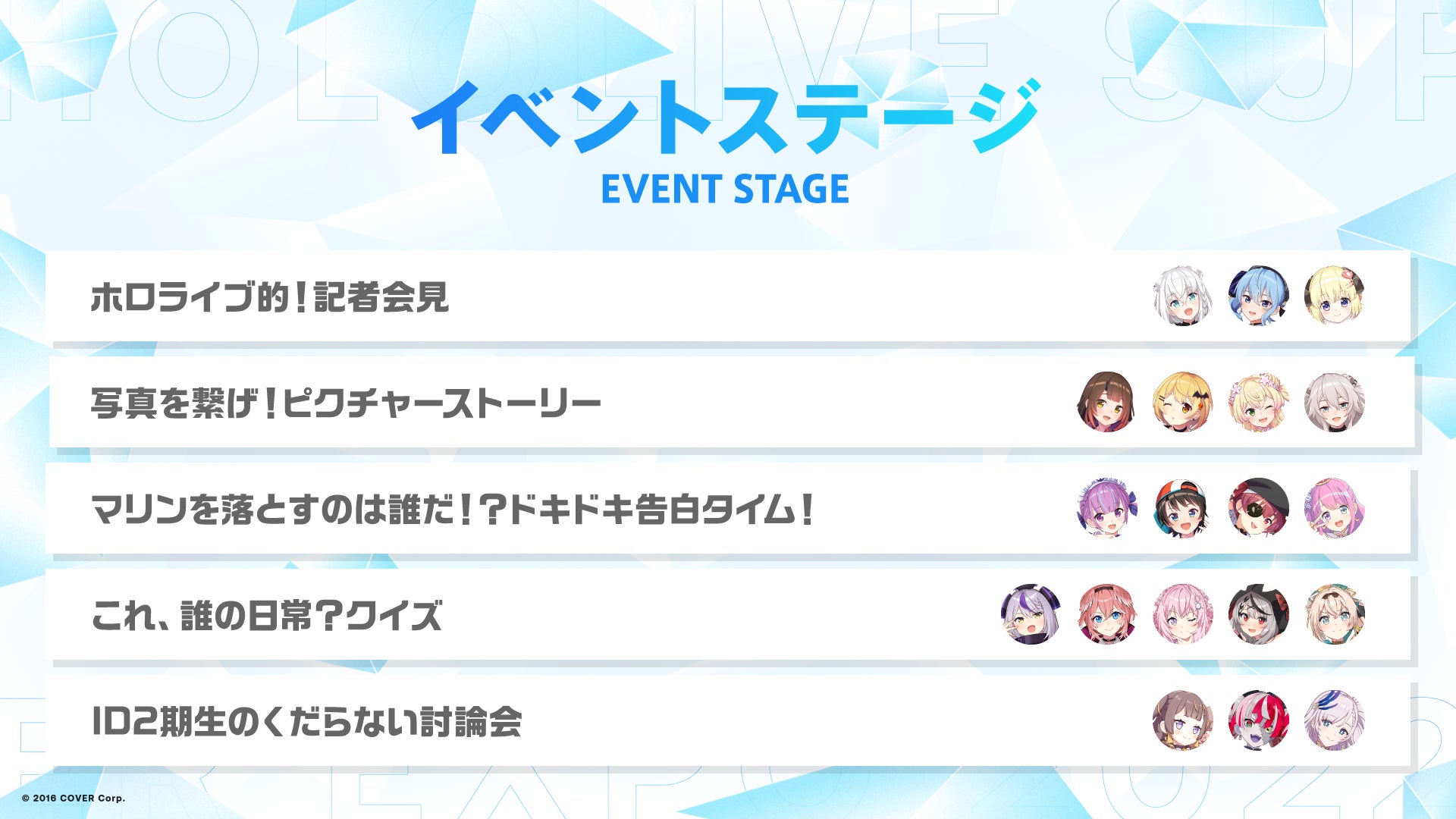 ときのそら / ロボ子さん / 夜空メル / アキ・ローゼンタール / 湊あくあ / 紫咲シオン / 百鬼あやめ / 癒月ちょこ / 大神ミオ / 猫又おかゆ / 兎田ぺこら / 潤羽るしあ / 不知火フレア / 角巻わため/ 雪花ラミィ / 獅白ぼたん / アユンダ・リス / アイラニ・イオフィフティーン / 森カリオペ / 小鳥遊キアラ