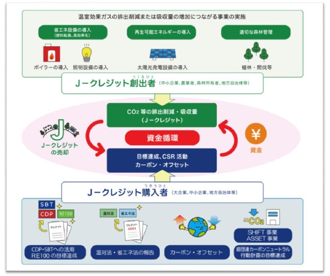 省エネルギー設備の導入や再生可能エネルギーの利用によるCO2等の排出削減量、適切な森林管理によるCO2等の吸収量などを日本国が「クレジット」として認証するものです。経団連カーボンニュートラル行動計画の目標達成やカーボンオフセットなど、様々な用途に活用することができます。