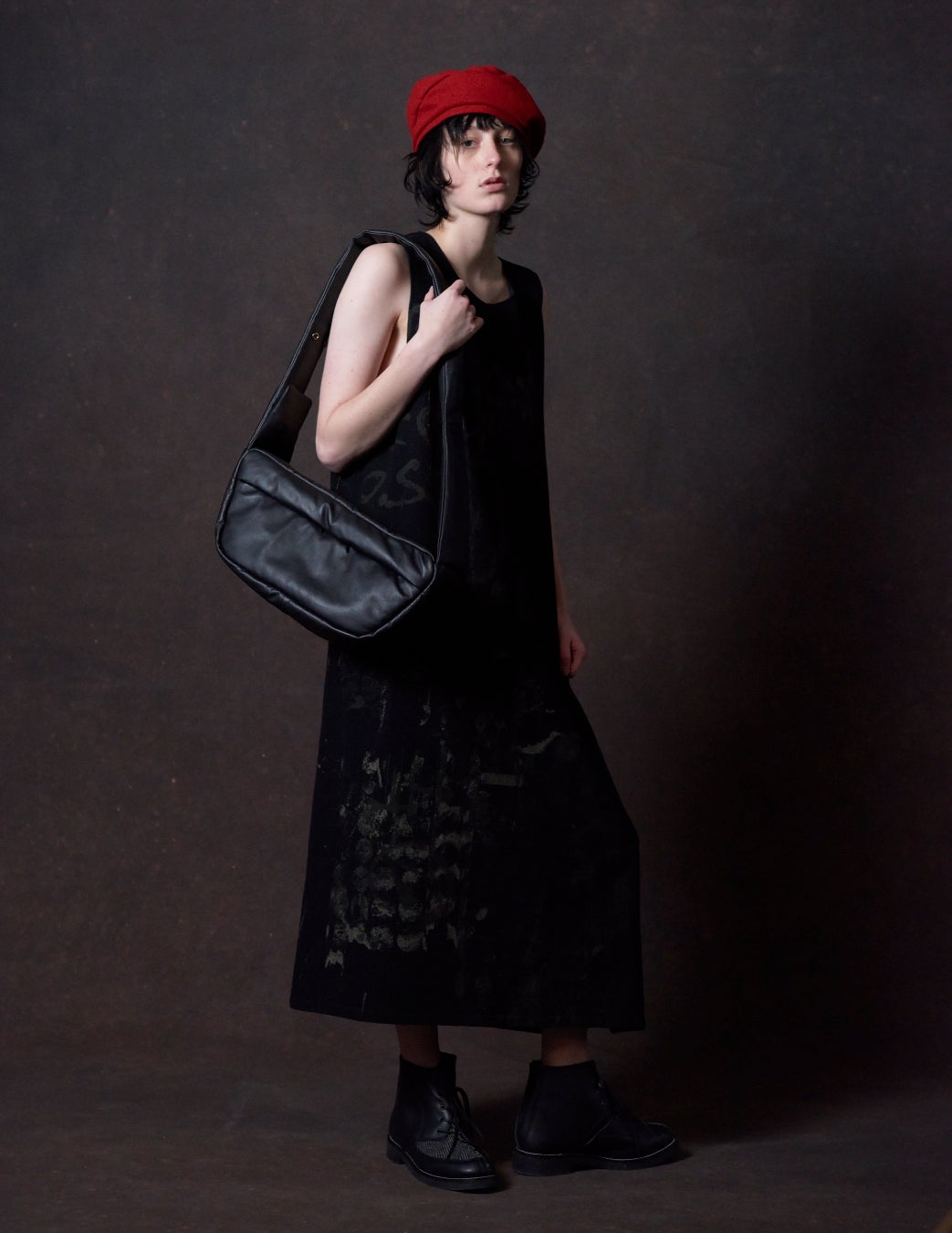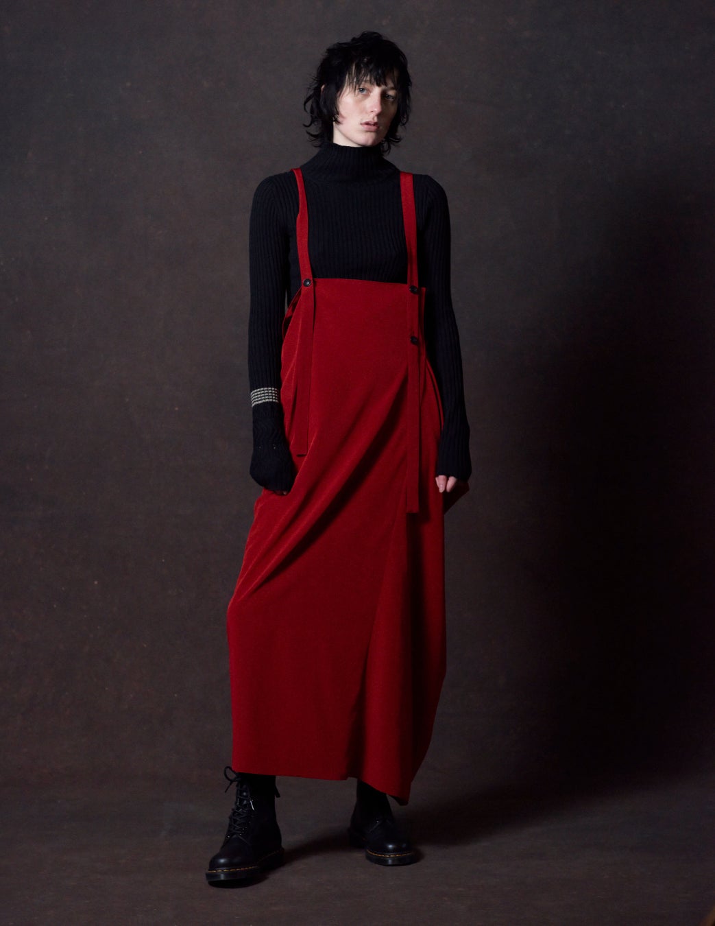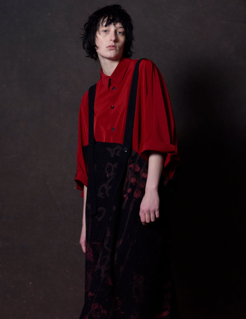 印象的な赤のドルマンスリーブ半袖シャツと、落書き柄のウールフラノでつくられた非対称の吊りドレス。