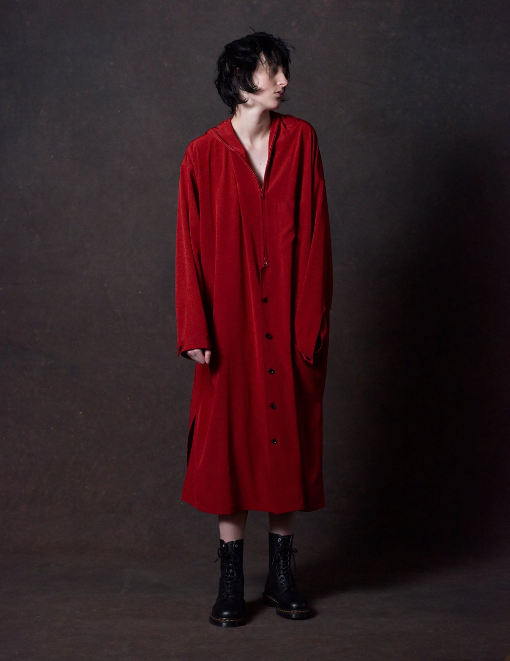 印象的な赤で描かれるアノラックパーカから着想を得たフード付きコート。羽織りとして、あるいはドレスのように1枚で着る事も可能。