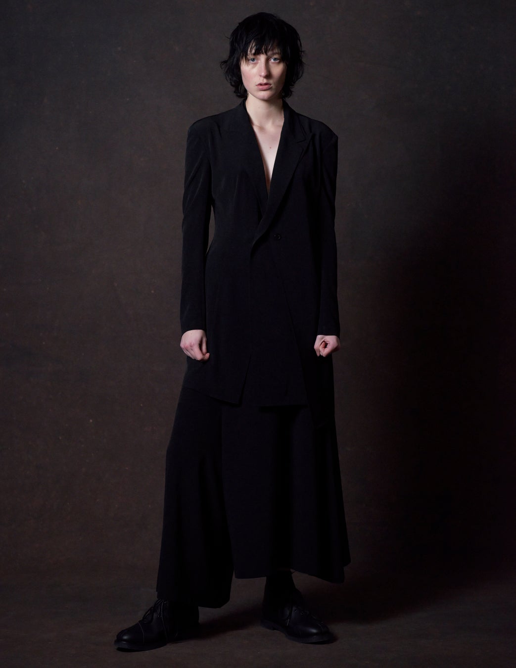 薄手の柔らかな生地でつくるテーラードジャケットとアシンメトリーフレアパンツ。