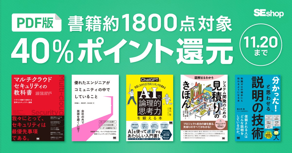 SEshopは、IT書・ビジネス書をはじめ、資格書や実⽤書まで幅広いラインナップを展開する翔泳社の公式通販サイトです。2025年11月20日(木)まで、PDF版書籍の対象書籍を購入すると、本体価格の40%をポイント還元するキャンペーンを開催します。貯まったポイントは1ポイント=1円として次回のお買い物から使えます。新刊含む約1,800点のタイトルが対象となります。