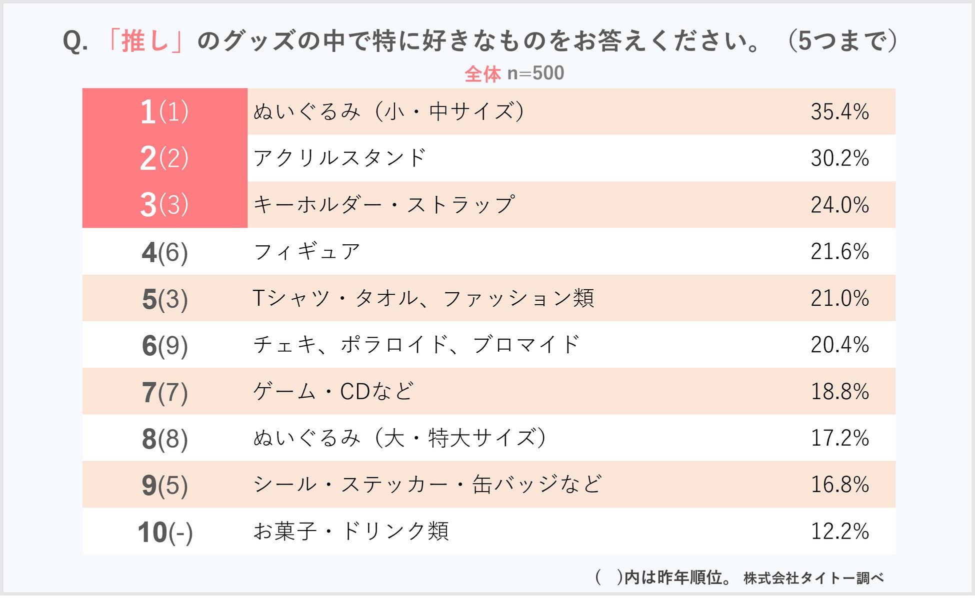 ■「推し」のグッズで好きなもの「ぬいぐるみ(小・中)」が昨年に続いて最も人気。2位「アクリルスタンド」3位「キーホルダー・ストラップ」を含め2年連続でトップ3は同じグッズとなった。