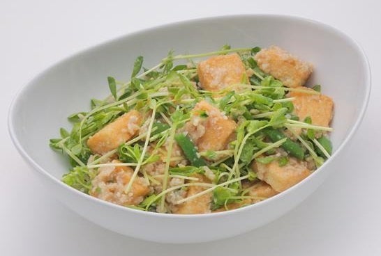 お客様の声を受け復活した総菜メニュー。ふわふわの厚揚げと豆苗の香りが、ほっとする味わいです。