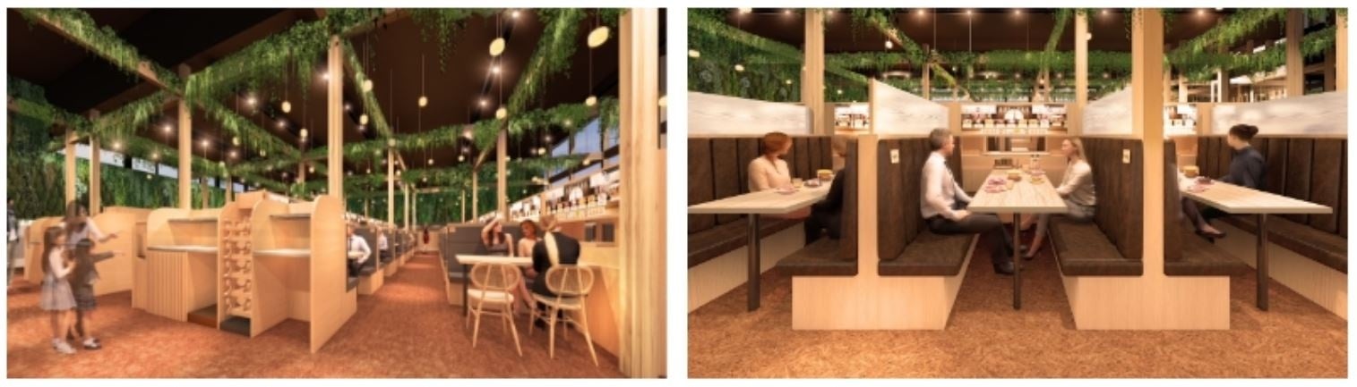 スシロー未来型万博店は、会場の中心部にある“静けさの森”の近くに出店します。静けさの森を借景とした森に溶け込む店舗デザインで、店内からも外の木々を眺めることができるため、まるで森の中にいるかのような空間でおすしを楽しんでいただけます。