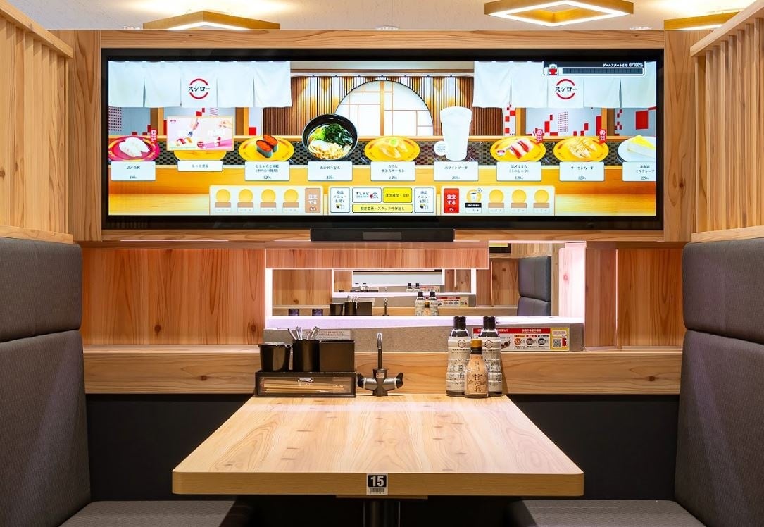 店内では、既存店舗で設置を開始しているデジタルビジョンと回転レーンを融合した「デジロー(デジタル スシロービジョン)」で、未来にまでつづく楽しい食卓をデジタルの活用により体験ができます。デジローはタッチパネルで注文を行い、完全オーダー制となることからも食品ロス削減や店舗運営の省人化にも繋がるシステムです。