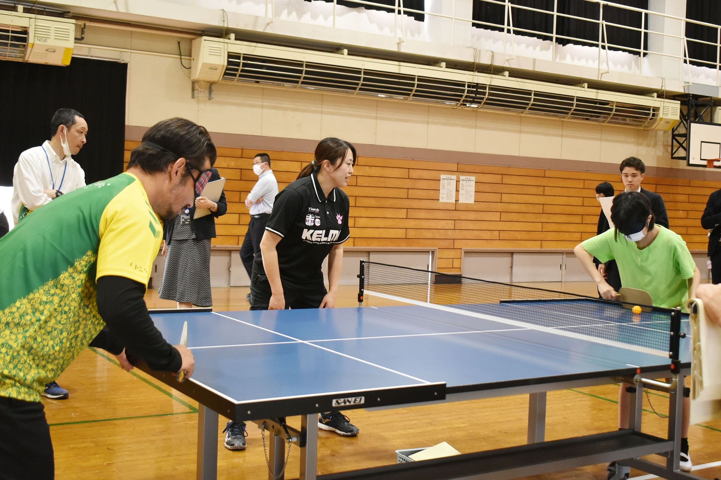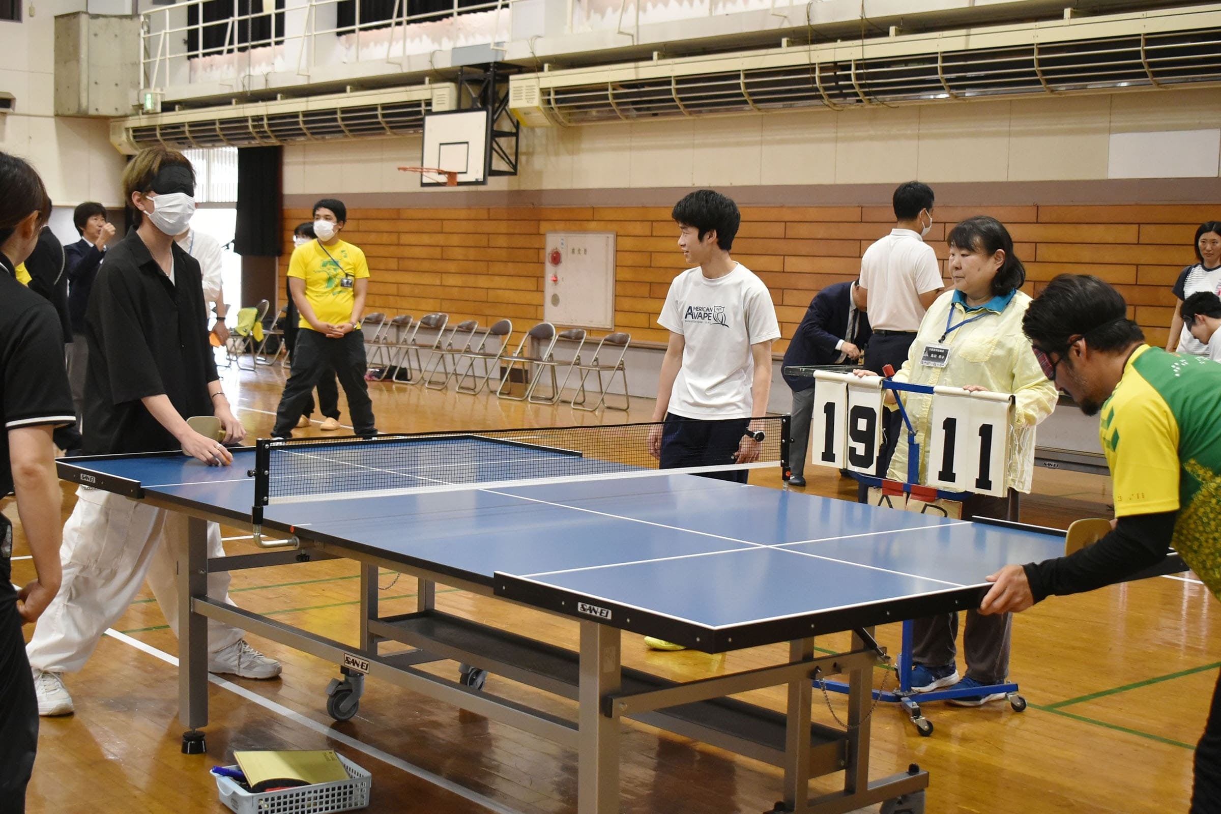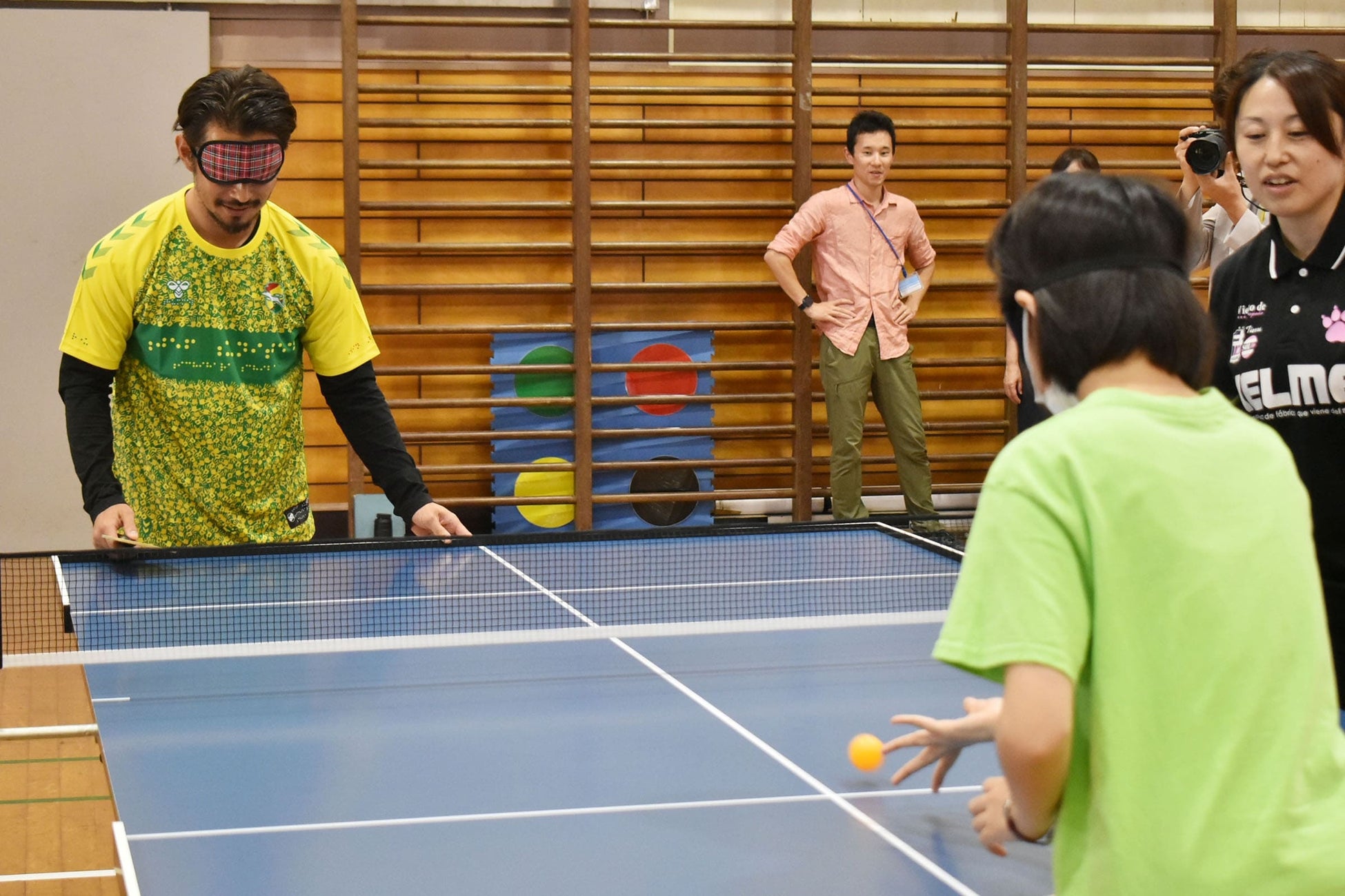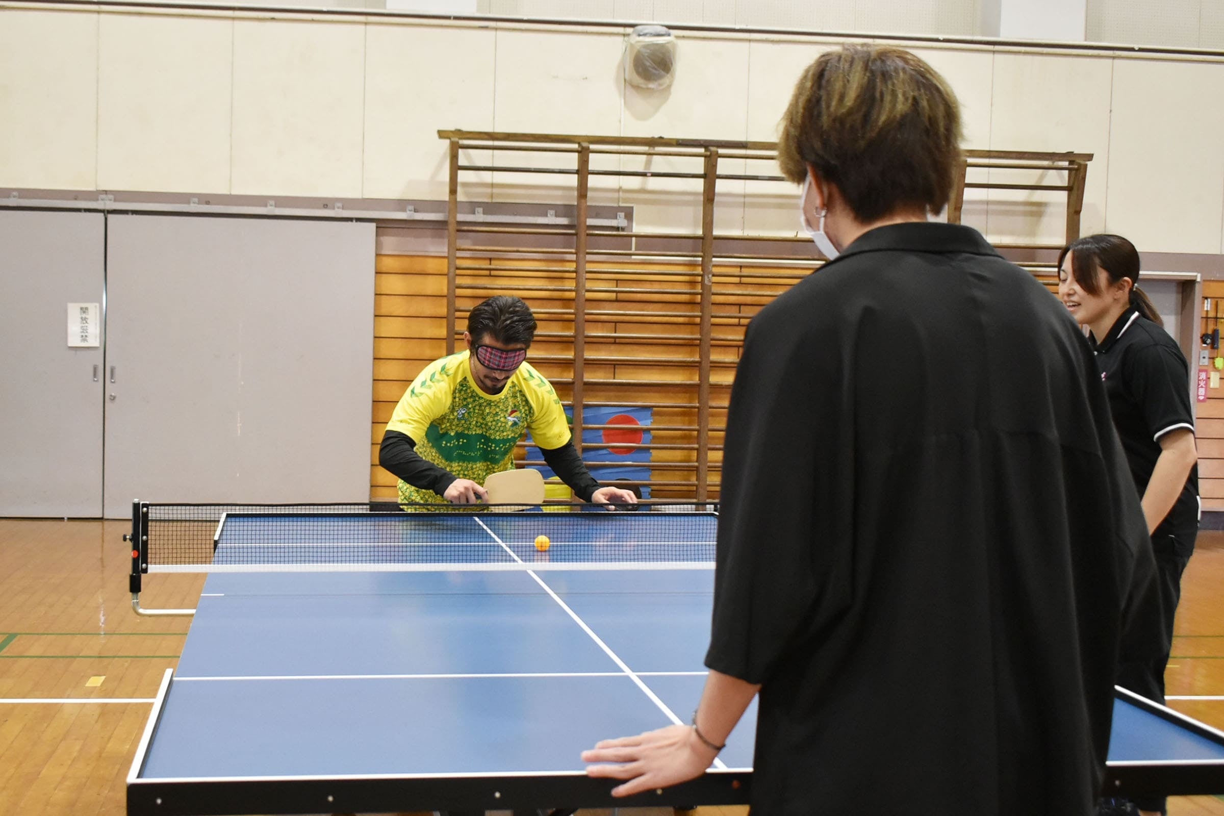 寄贈に加えて、サウンドテーブルテニス(STT)で高等部の生徒たちと交流を図りました。STTは、金属の球が入ったボールを転がしてラリーする視覚障がい者が行う卓球で、全員がアイマスクを付けてプレー。アスリートらしく、勝負事には手を抜かない佐藤さんは、「僕が上手くできないから、(対戦相手の)網谷君は、途中から左手を使って試合したんですよ。それでも負けてしまい、悔しいですね」とSTTをみんなで楽しみました。