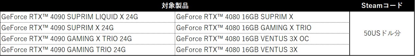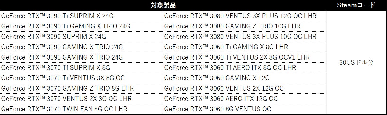 MSI GeForce RTX 40シリーズをご購入いただいた方には50USドル分のSteamウォレットコードをプレゼント、MSI GeForce RTX 30シリーズをご購入いただいた方には30USドル分のSteamウォレットコードをプレゼントいたします。