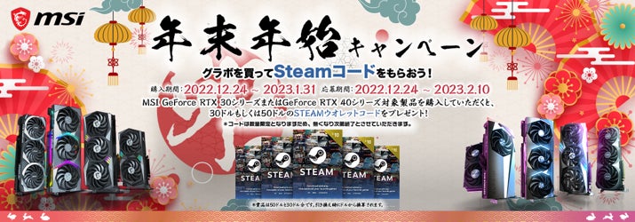 エムエスアイコンピュータージャパン株式会社は、2022年12月24日(土)から対象のグラフィックスカードを購入いただいた方に、最大50USドル相当のSteamウォレットコードをプレゼントする「MSI 年末年始キャンペーン グラボを買ってSteamコードをもらおう!」を開催いたします。