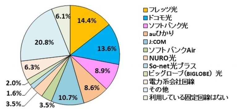 固定回線の事業者別の内訳では、フレッツ光とドコモ光のNTT系が合わせて28%を占めました。NTTから回線を借りてサービスを提供している事業者もたくさんありますから、NTTのシェアは突出しています。また、電力系会社回線が6.3%と一定のシェアを占めているのは、光ファイバーを張り巡らせることのできる電柱を持つ強みでしょう。