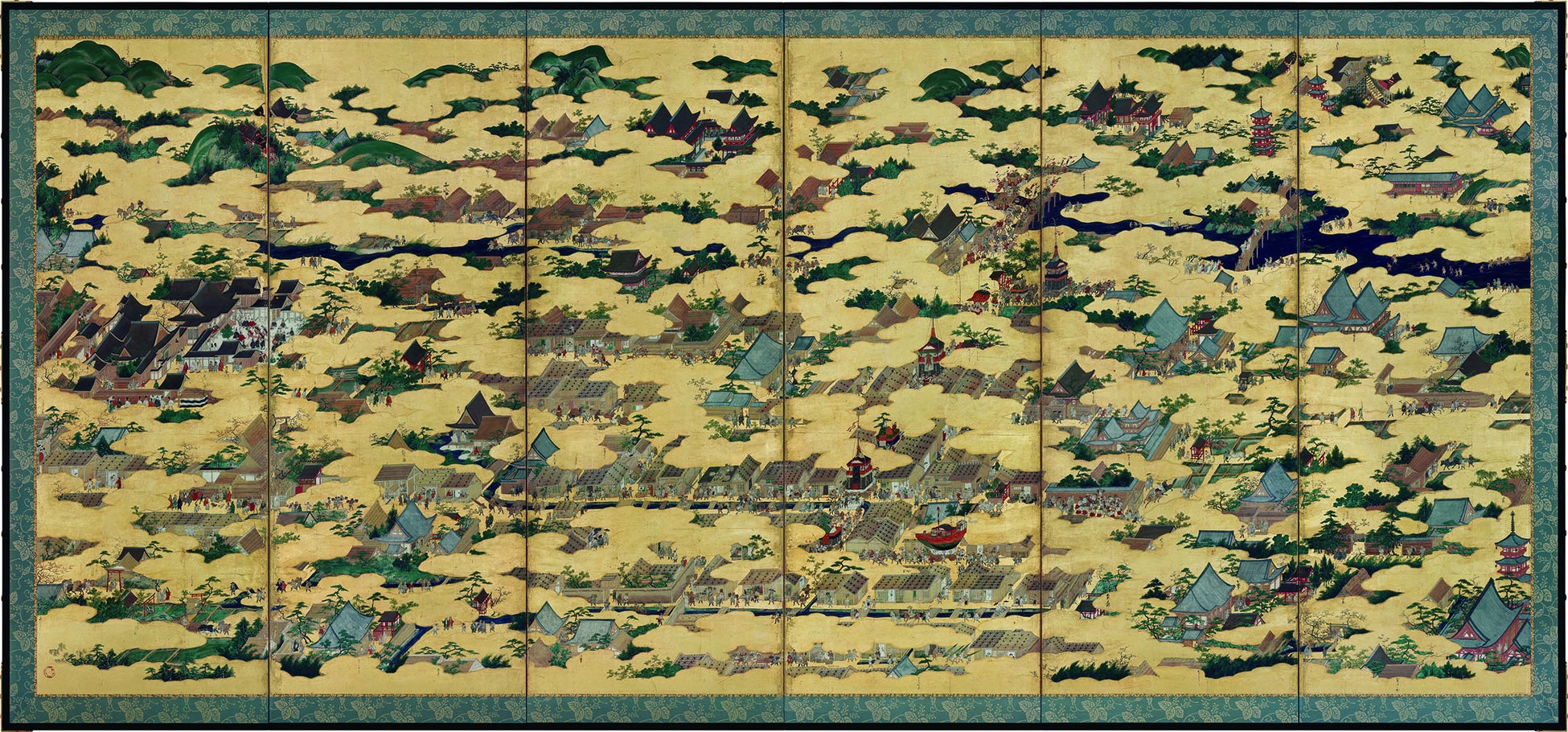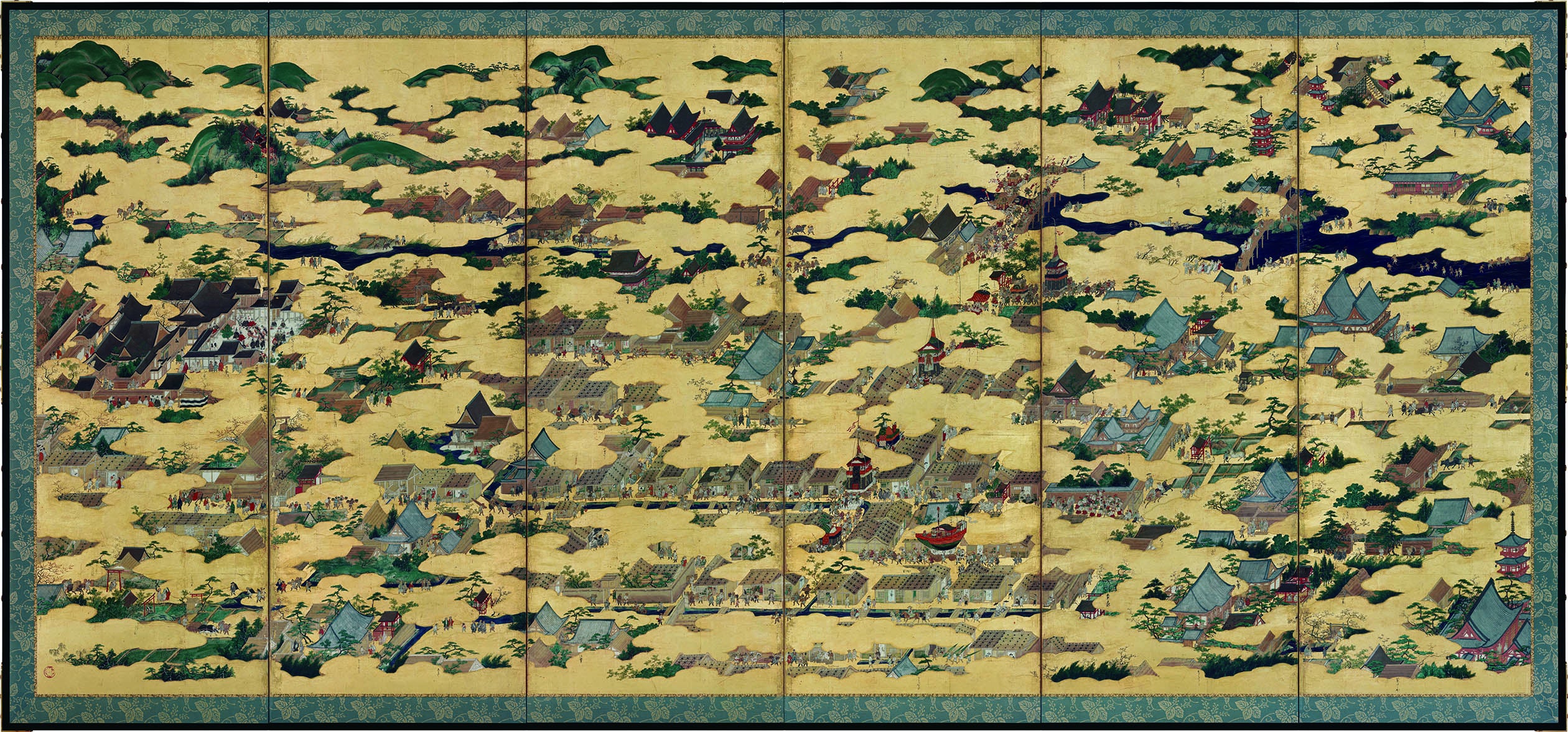 屏風の右隻には、清水寺や八坂の塔、三十三間堂、東寺などの名所が描かれているほか、烏丸通、祇園祭でにぎわう町の様子が描かれています。また、左隻には、雪化粧の金閣寺や鞍馬山、公方邸(将軍の屋敷)などの屋敷が描かれています。