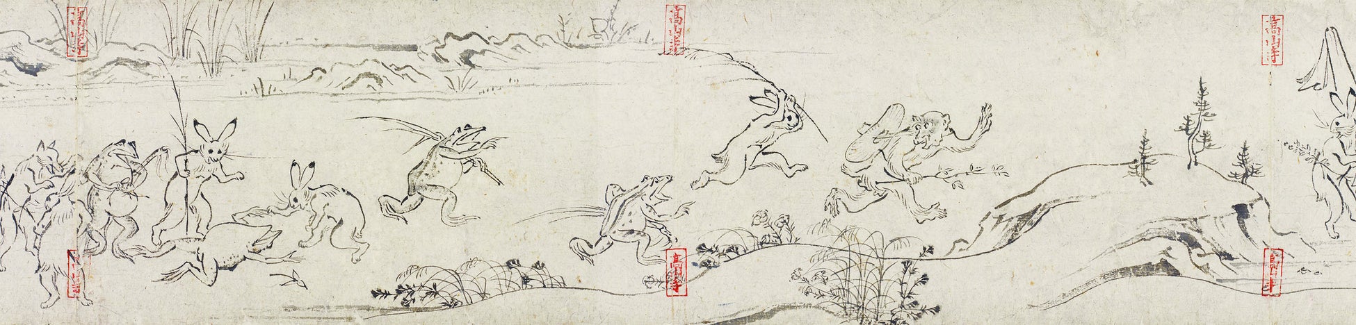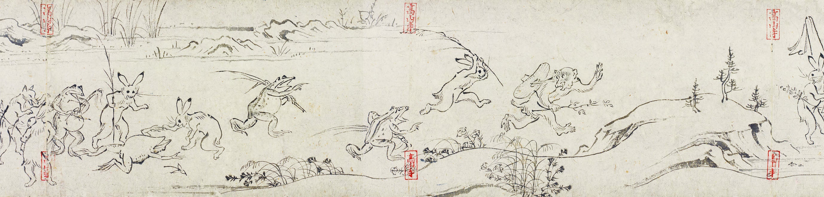 「鳥獣人物戯画」は、平安時代後期から鎌倉時代前期にかけて制作された、甲、乙、丙、丁の4巻からなる絵巻物です。有名な甲巻(こうかん)には、ウサギやサル、カエルといった動物たちが擬人化され、相撲や水遊び、おいかけっこを繰り広げる様子が描かれています。作者については不明ですが、各巻の筆使いの違いから、複数の絵師が関わったと考えられています。