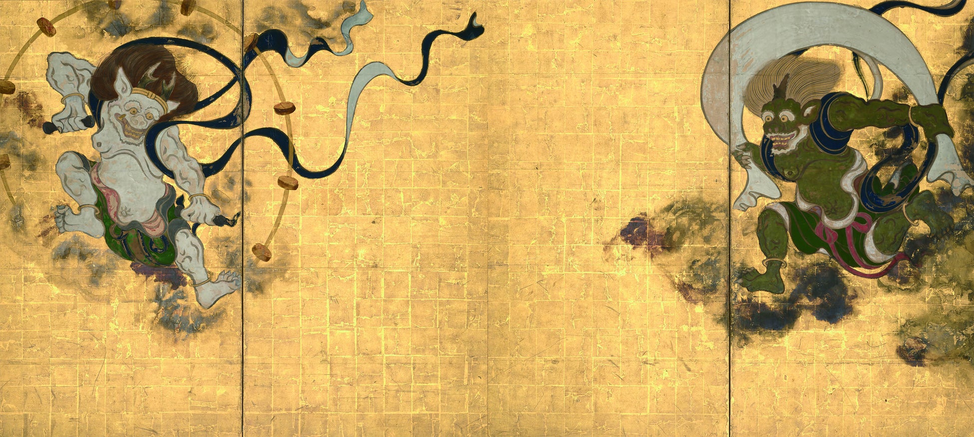 「風神雷神図屏風」は、江戸時代初期の寛永文化を代表とする作品で、作者は画家・俵屋宗達であると考えられています。風神と雷神が画面の端にはみ出した、とても大胆な構図で描かれており、中央の余白によって、空間の広がりや2神の躍動感を見る人に与えています。そして、黒く描かれた雲にも、独自の技法が使われています。