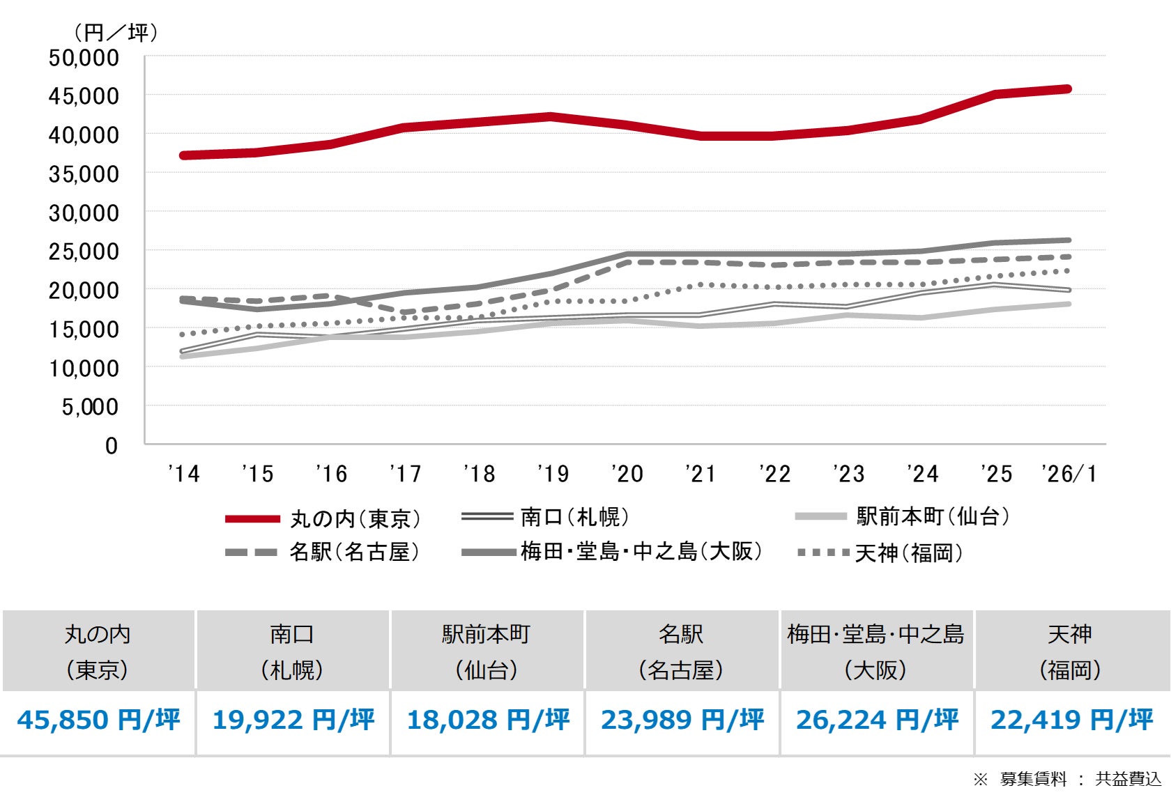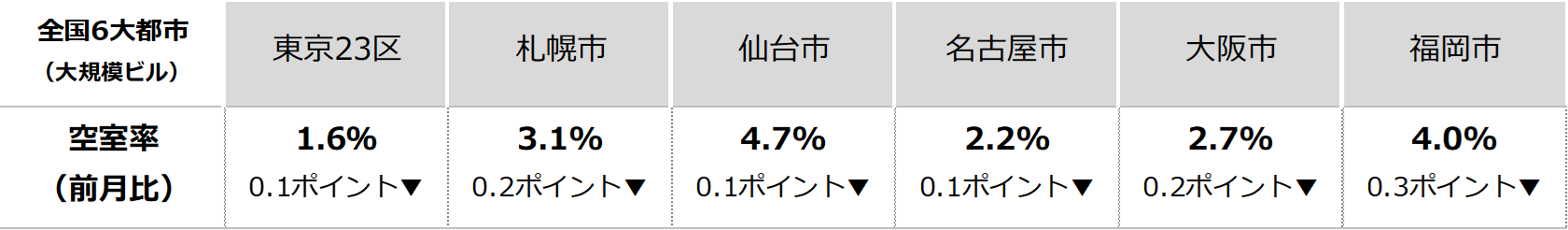 三幸エステート株式会社(本社:東京都中央区、取締役社長:福島正二郎)は、2026年1月度の東京都心5区(千代田区、中央区、港区、新宿区、渋谷区)および全国6大都市(東京、札幌、仙台、名古屋、大阪、福岡)の大規模ビル※1のマーケットデータをまとめた「オフィスマーケット2026年2月号」を公表します。