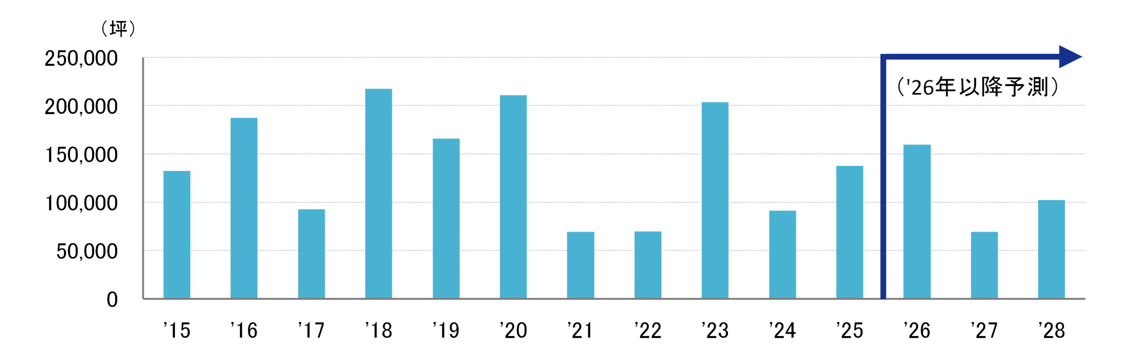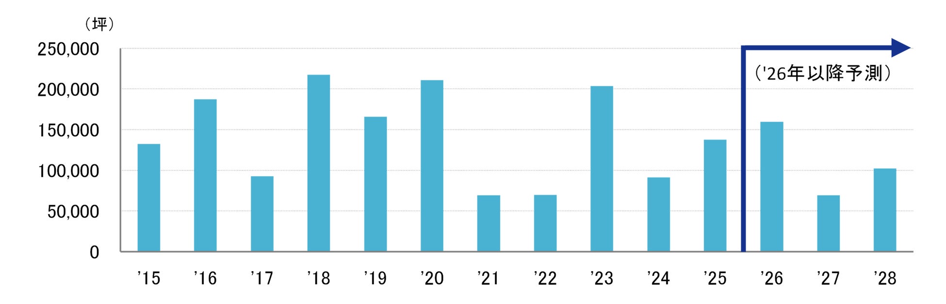 2025年の大規模ビルの新規供給は港区を中心に14万坪となったが、2026年は16万坪の予定となっている。区別で見ると中央区で9万坪が竣工予定と、供給が集中する見込みだ。