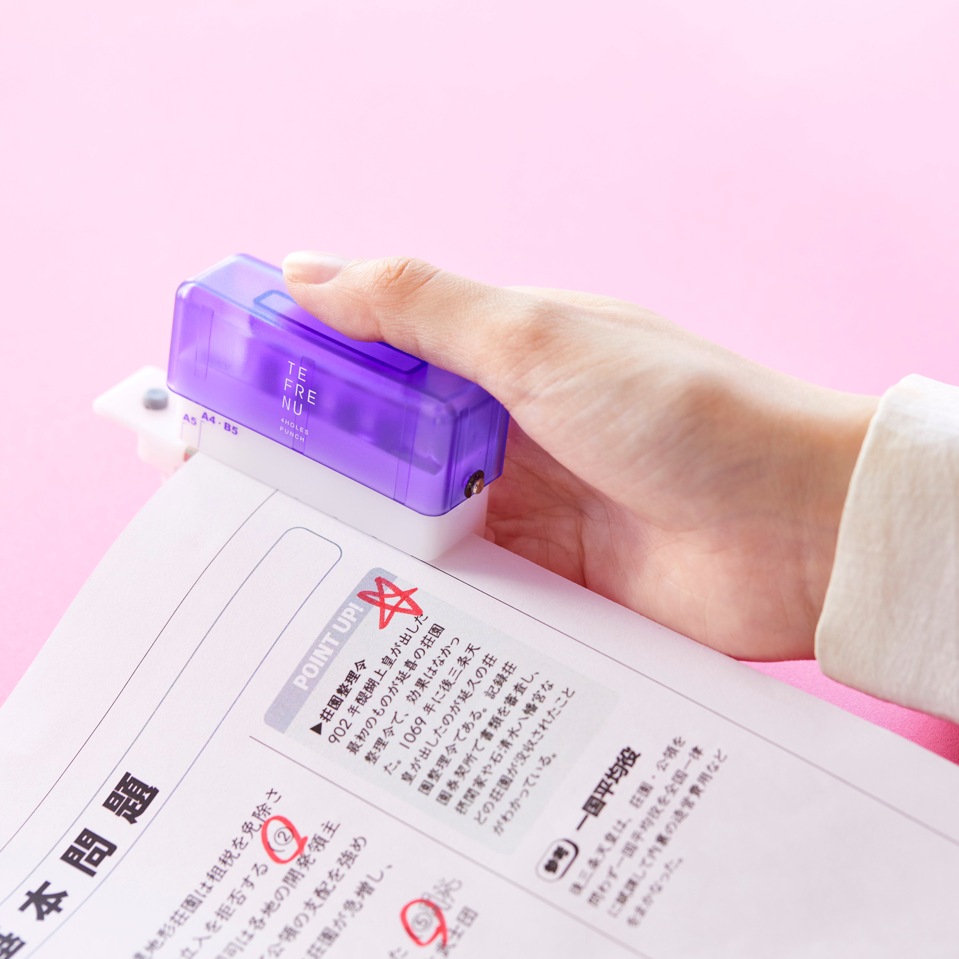 「テフレーヌ 4穴ミニパンチ」は一度に4個の穴をあけることができるパンチです。上下に1か所ずつ穴をあけるだけで簡単に「テフレーヌ」にプリントをとじることができ、連続で穴をあければ市販の多穴バインダーにもとじることができます。A5・B5・A4のガイド付きで、穴をあけるプリントのサイズに合わせて使用します。ペンケースに入れることができるコンパクトなサイズで、カラーはムラサキ、シロの2種類です。