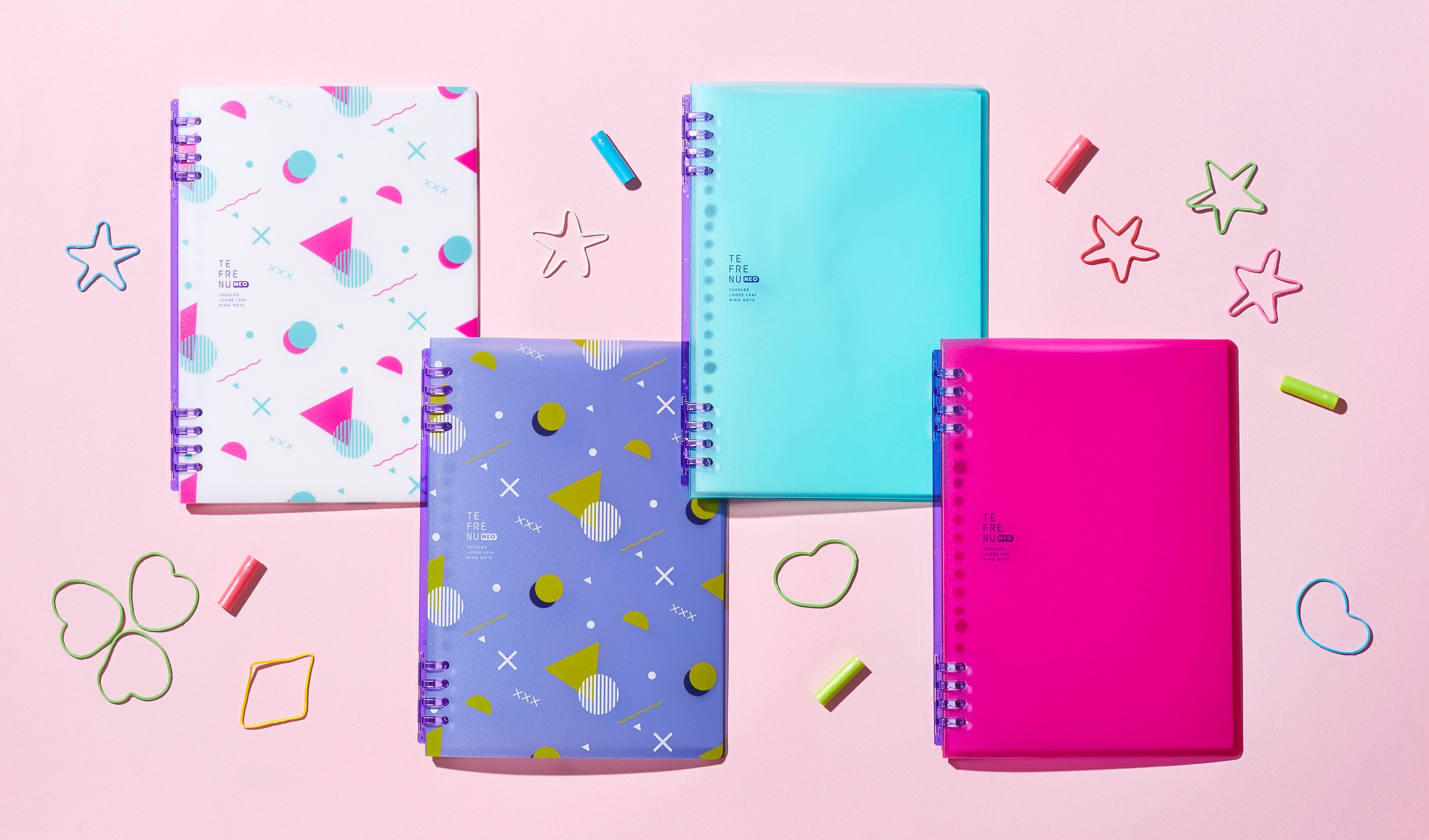 今回、新たに追加する「テフレーヌ ネオ」はトレンド感あふれる“Y2Kデザイン”を採用し、ビビッドカラーとリバイバルデザインの“メンフィス柄”が特長です。サイズ展開はA5、B5、A4の3種類で、カラーは無地2種類と、柄付き2種類の合計4種類です。