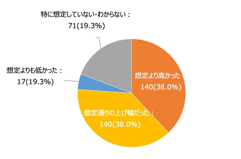 まず、最低賃金の2024年の引き上げ額が全国平均で過去最大の50円となったことについて意見を聞いたところ、「想定より高かった」「想定通りの上げ幅だった」がどちらも38.0%、「想定より低かった」(4.6%)という結果になりました。