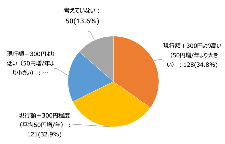 続いて、今から6年後の2030年に最低賃金がどの程度上がっているか聞いたところ、最も多かったのは、「現行額+300円より高い額となる(年あたりアップ額は50円より大きい)」(34.8%)で、続いて「現行額+300円程度となる(年あたり平均50円アップ)ム」(32.9%)、という結果に。「現行額+300円より低い額となる(年あたりアップ額は50円より小さい」は18.8%にとどまりました。
