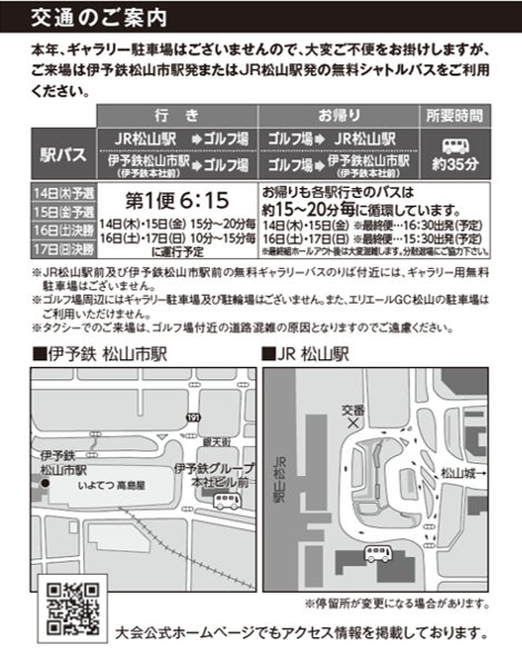 ギャラリー駐車場のご用意は中止とさせていただきます。大変ご不便をおかけしますが、ご来場の際はいよてつ松山市駅およびJR松山駅発の無料シャトルバスをご利用ください。(所要時間約35分)