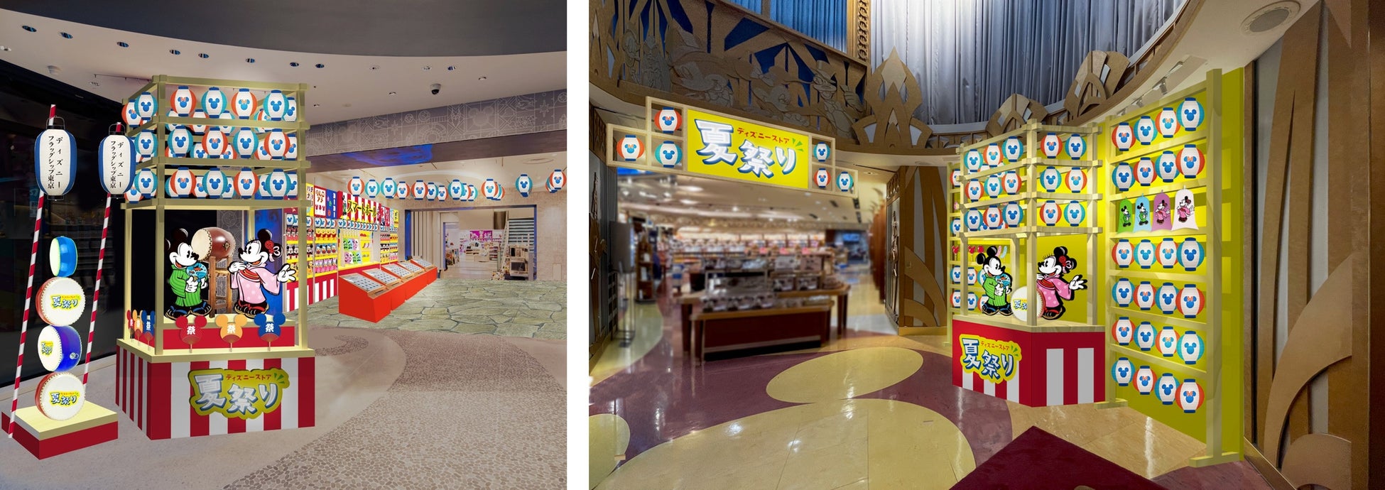 ディズニーフラッグシップ東京と東京ディズニーリゾート店では、7月23日(火)から期間限定で夏祭りならではの特別な装飾を展開します。エントランスの盆踊りやぐらをイメージした装飾では、浴衣姿のミッキーマウスとミニ―マウスがゲストの皆様をお出迎えします。さらに、ディズニーフラッグシップ東京1階の特設コーナーには、夏祭りの屋台をイメージした装飾が並びます。