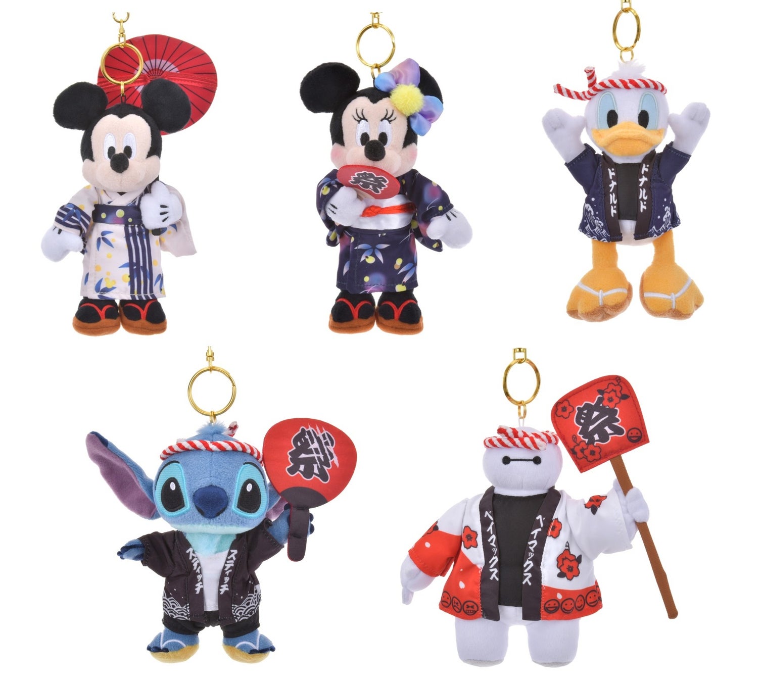 夏祭りシーズンに合わせて、浴衣やはっぴなどのお祭りコスチューム姿のミッキーやミニー、ドナルド、スティッチ、ベイマックスのぬいぐるみキーチェーンが登場します。お手持ちのバッグに付けて、お祭りや花火大会など夏のおでかけを一緒にお楽しみいただけます。