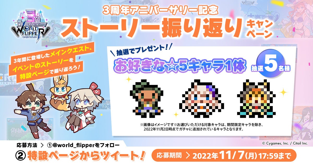 『ワールドフリッパー』の「メインクエスト」や「ストーリーイベント」を振り返り、お気に入りのポイントや好きなシーンをTwitterに投稿した方の中から抽選で、5名にお好きな★5キャラ1体をプレゼントします。